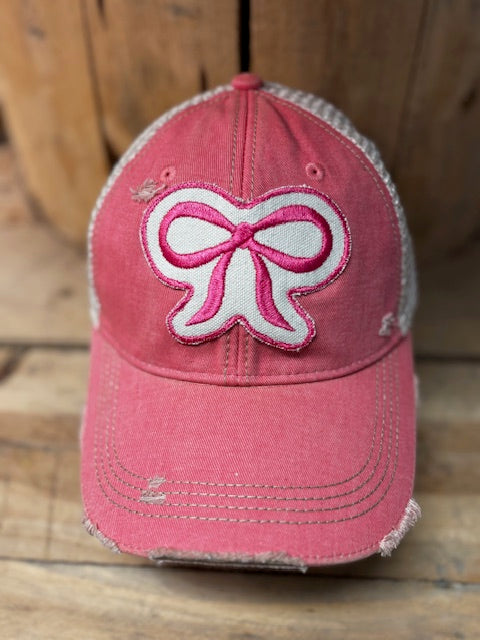 PINK BOW Distressed Tan Mesh Snapback Baseball Cap