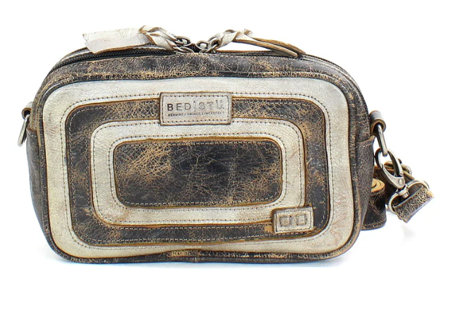 - Two-toned rectangular crossbody with leather overlays and piping for dramatic stand-out style