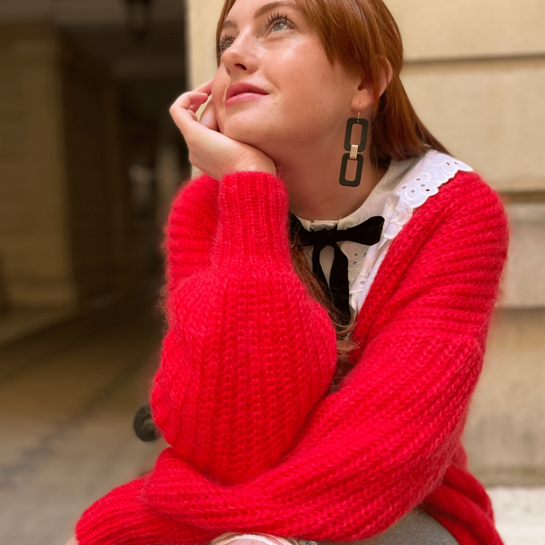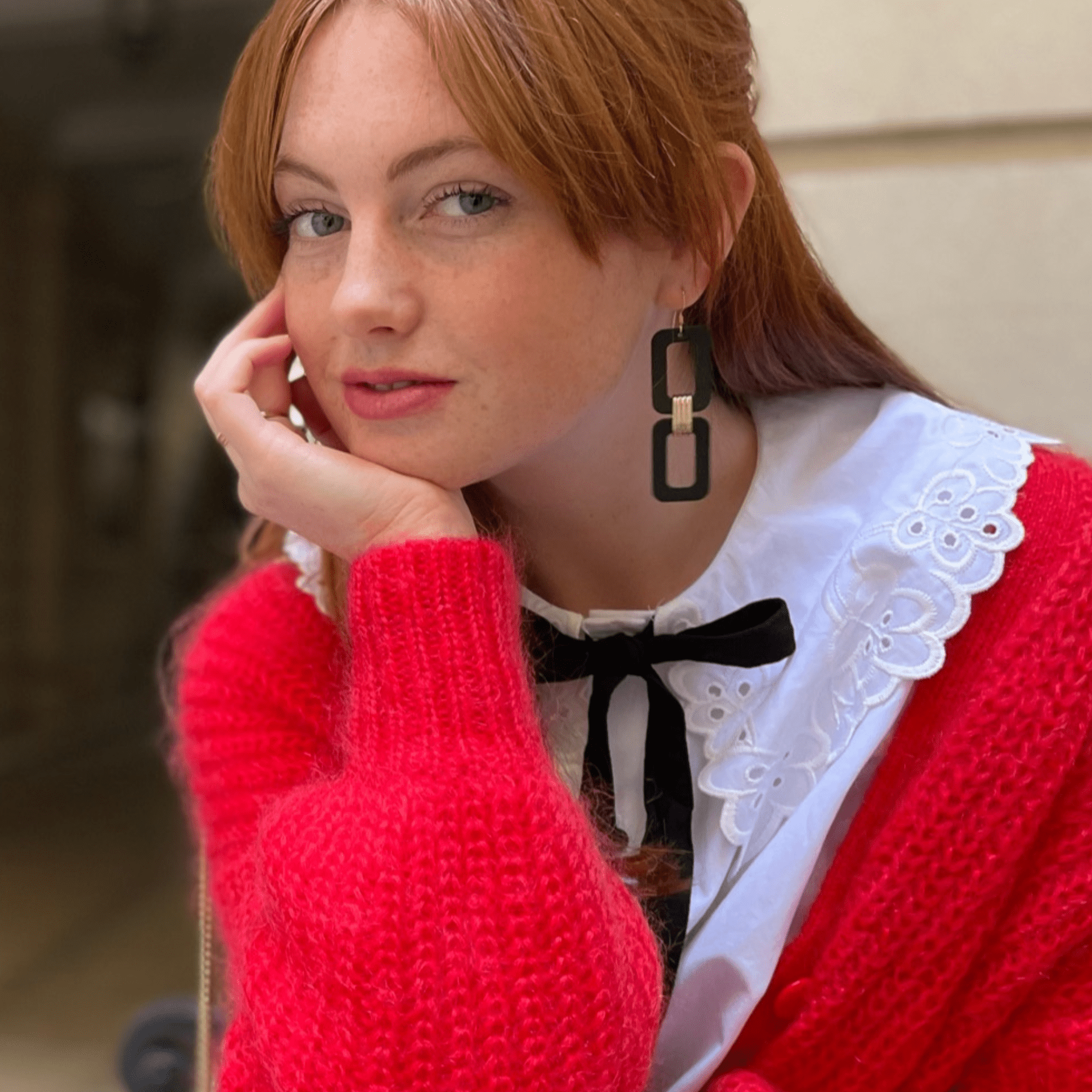The Black Blakely is a chain-inspired earring featuring two square cut-out shapes in smooth black leather. This lightweight earring features a gold accent piece affixing the shapes together.