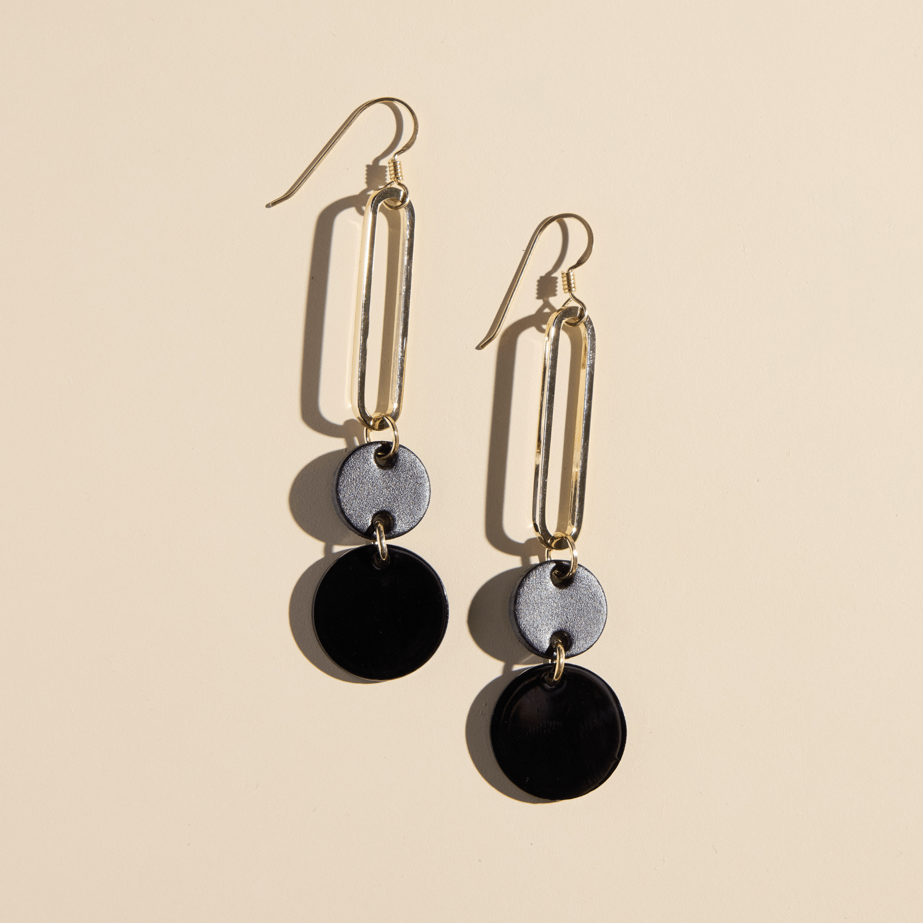 These on-trend statement earrings feature our smooth black leather and shiny black resin accents. These accent pieces are attached to gold hardware for a modern earring that is perfect for year-round wear.