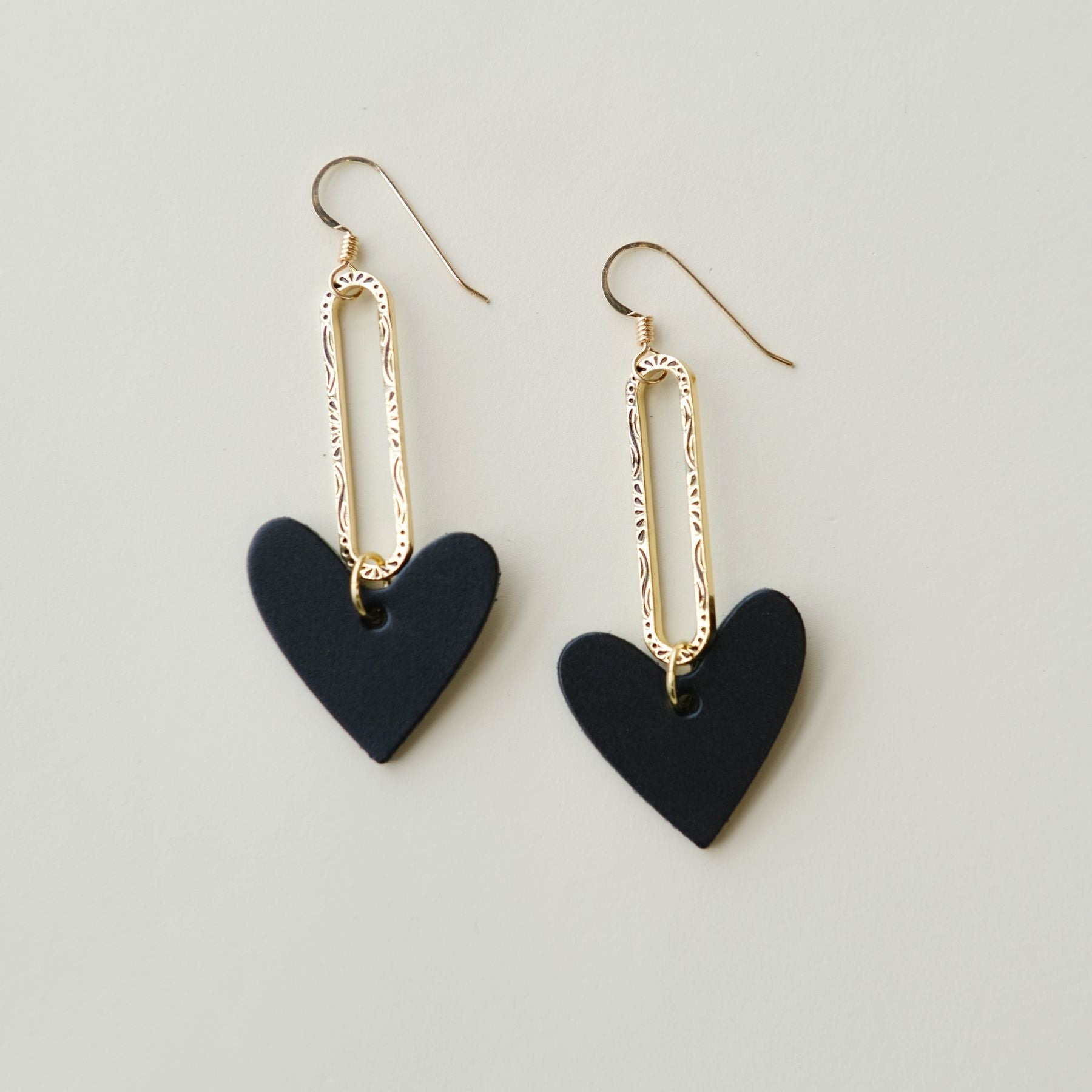 The Western Milas are drop statement earrings inspired by our patented Sweetheart hoop earring design. With a subtle etched filigree design on the metal component, this style boasts a western touch perfect for your everyday or boho-inspired look. These lightweight earrings feature our smooth black leather, attached to your choice of gold or silver component.