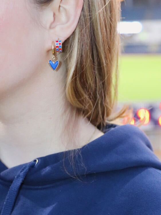 On-trend sweetheart huggies are ideal for mixing and stacking. Inspired by their namesake statement earring, these petite hoops feature a hanging blue stone charm in gold plating over brass with a hinged closure.