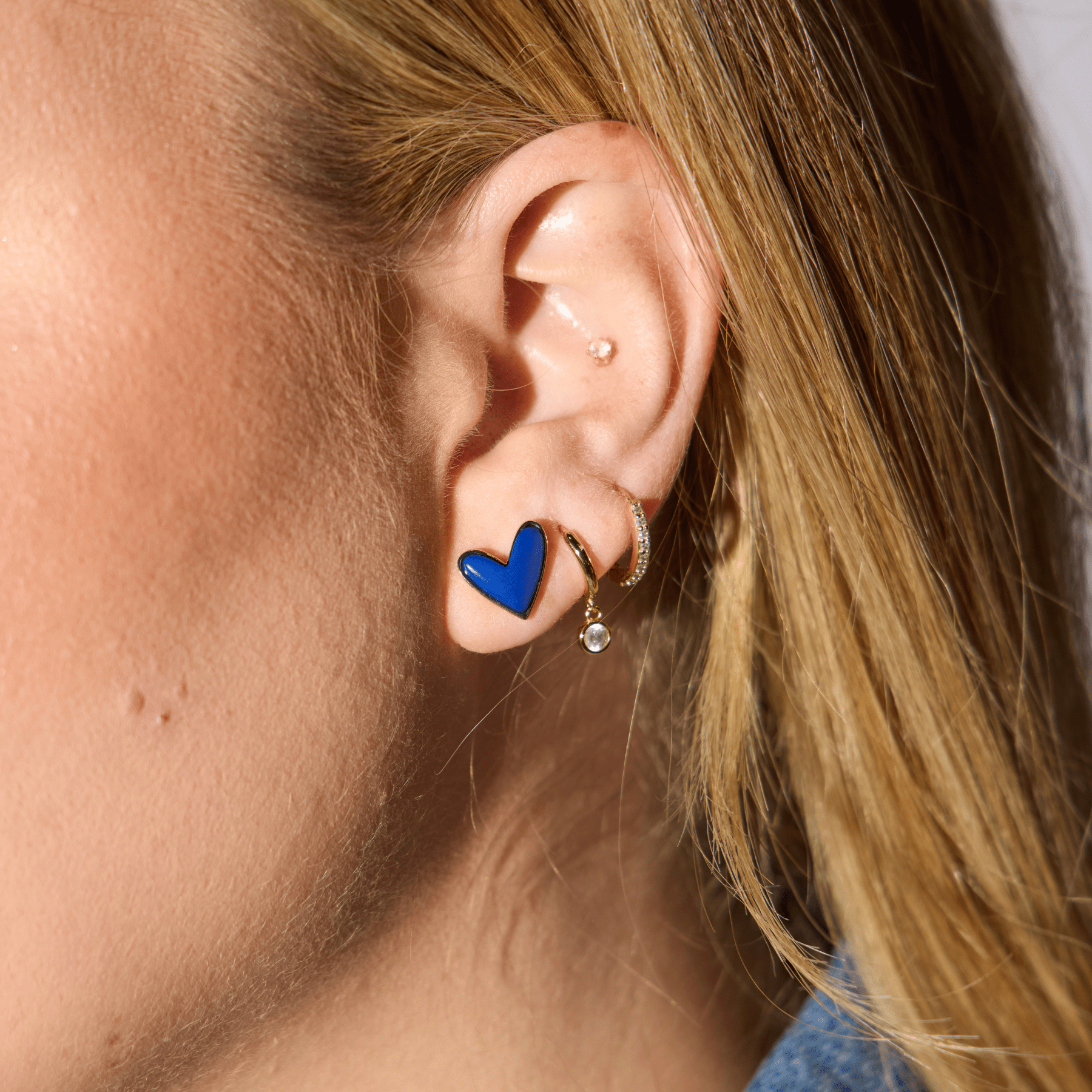 The Blue Stone Sweetheart Studs features our signature heart shape, inspired by our patented Sweetheart statement earrings. These delicate stud earrings features a blue stone with gold detailing.