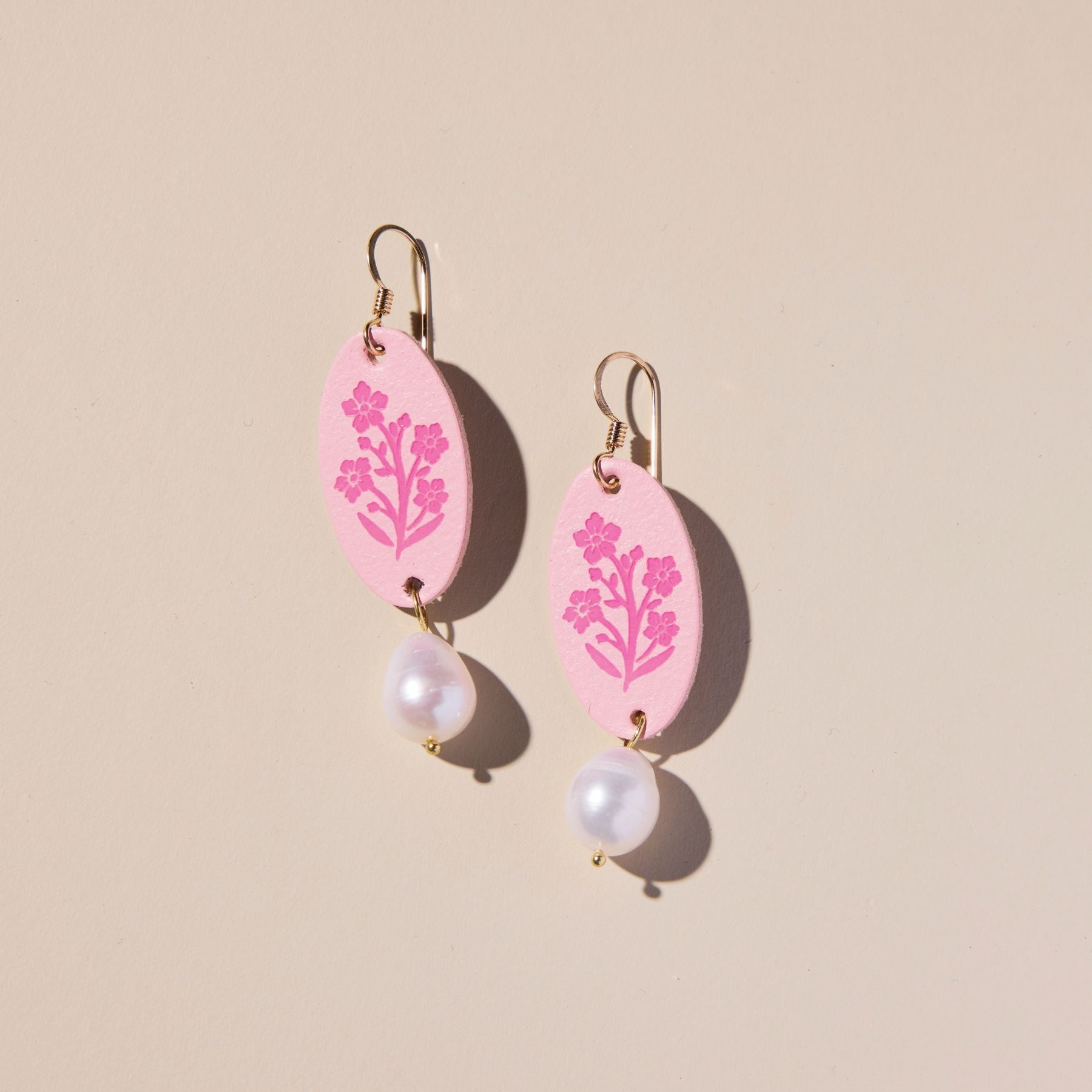 The Cameo Sadie features a delicate foil floral design on smooth Cameo pink leather, with a cultured drop pearl set on gold hardware for a touch of nostalgia and refinement for any occasion.