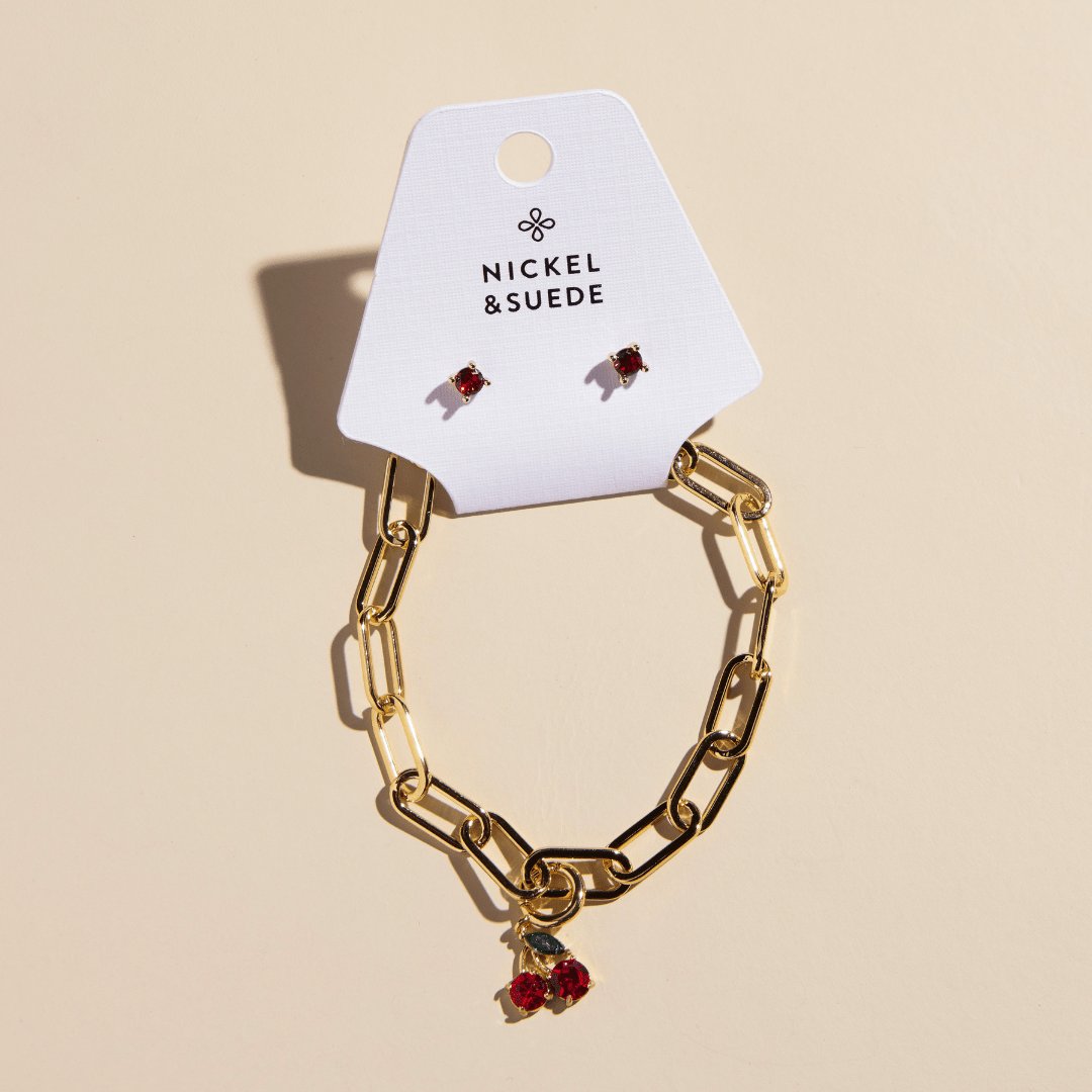 This adorable set features a gold Paper Clip Chain Bracelet, a Cherry Charm and the Red Crystal Studs. This is a great starter charm bracelet and you can add more of our charms to personalize it. This would be the perfect gift for someone you love!