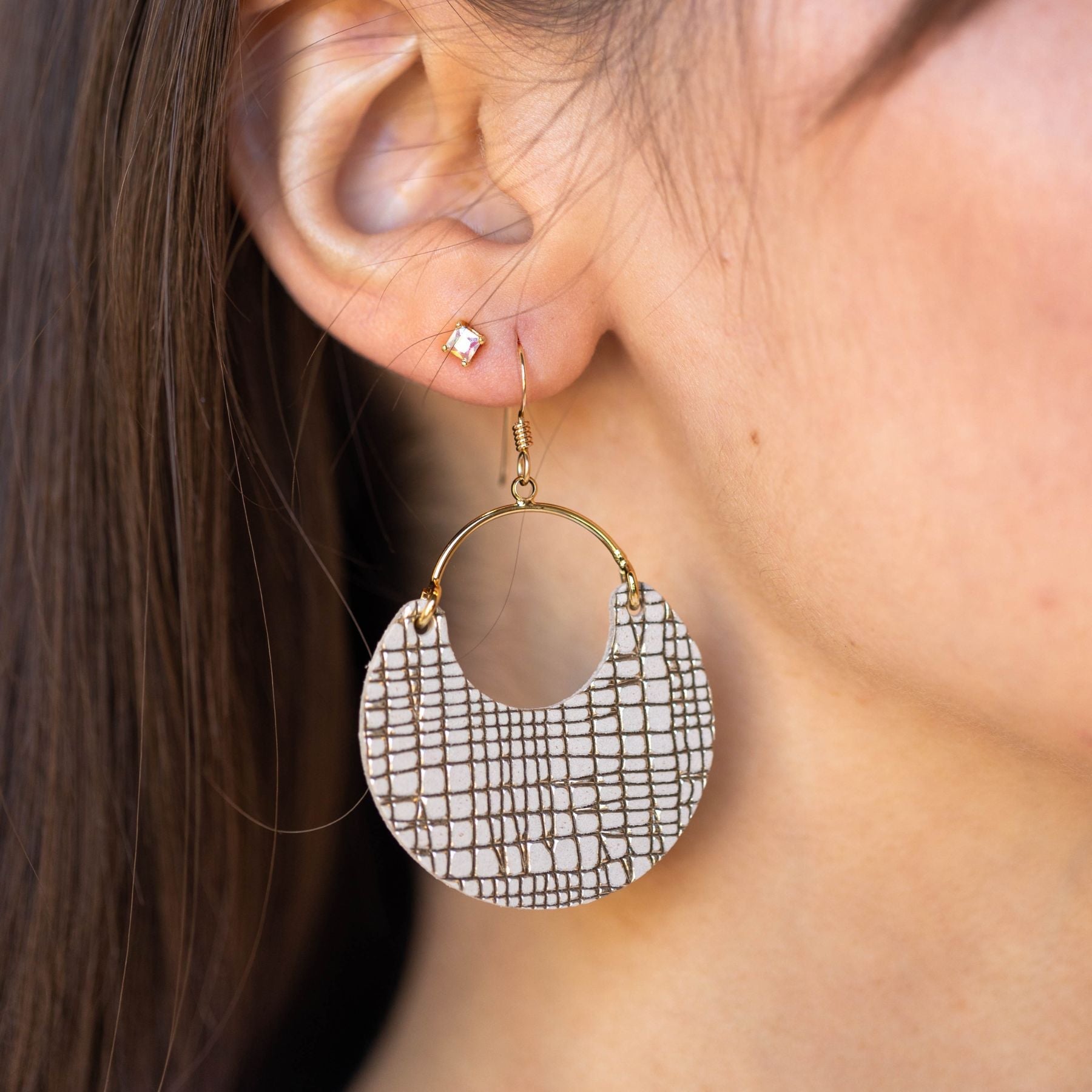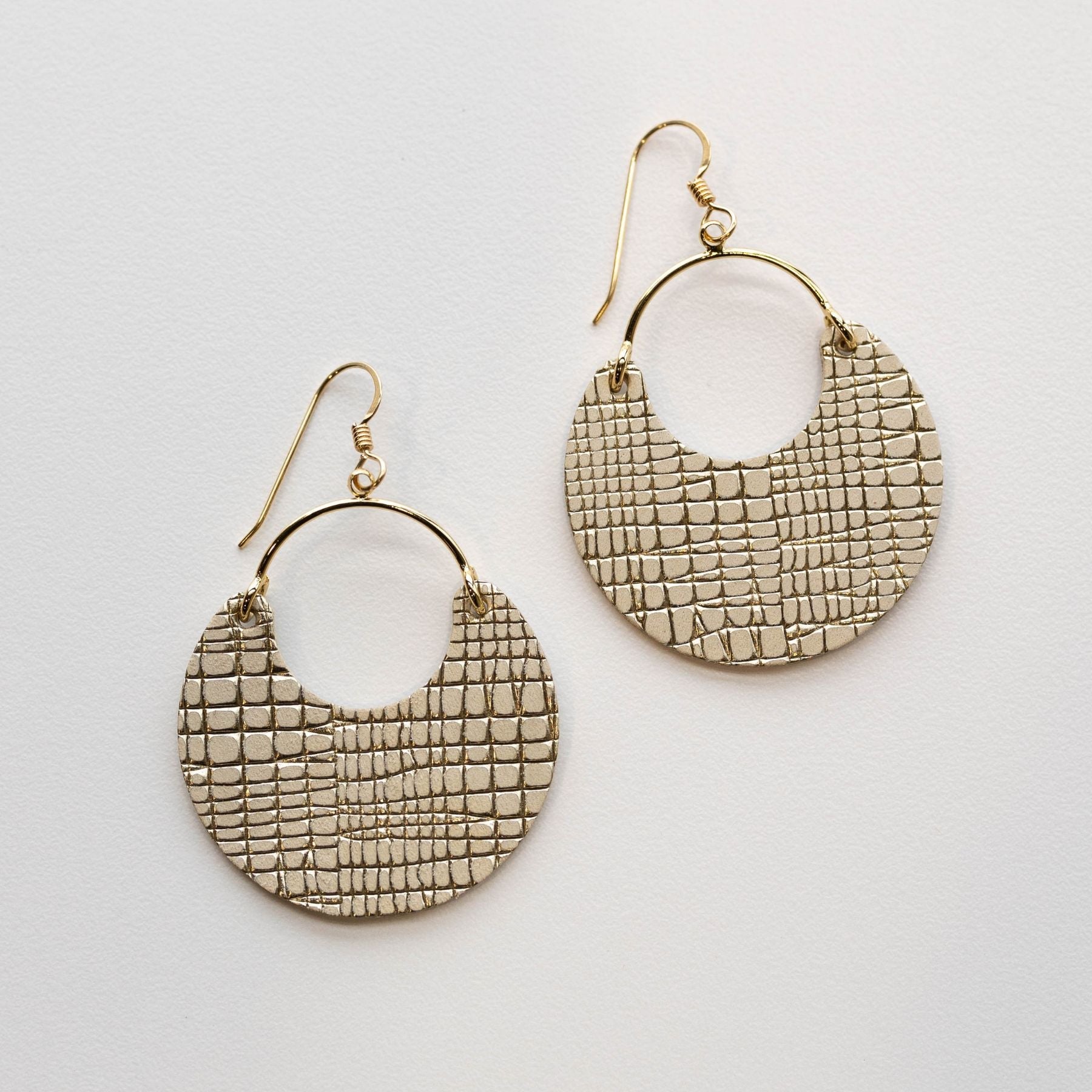 The Ninas are a fresh take on the rounded crescent shape. This style is made with our shimmering neutral Cream Trellis leather, and available on gold and silver hardware.