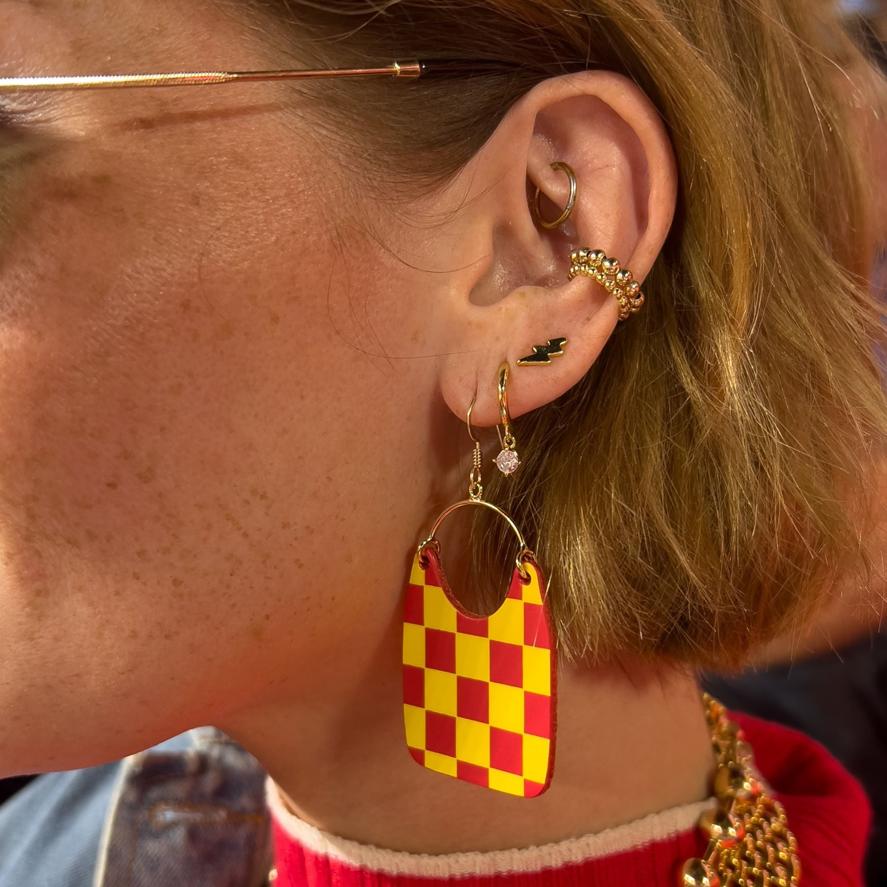 Elevate your game day look with our Crimson & Yellow Checkmate Charlies. Be the biggest fan, while looking cute and chic on game day. These unique Checkmate Charlie earrings are designed to honor the Kansas City Chiefs. This earring is perfect for showing off your team spirit in style.