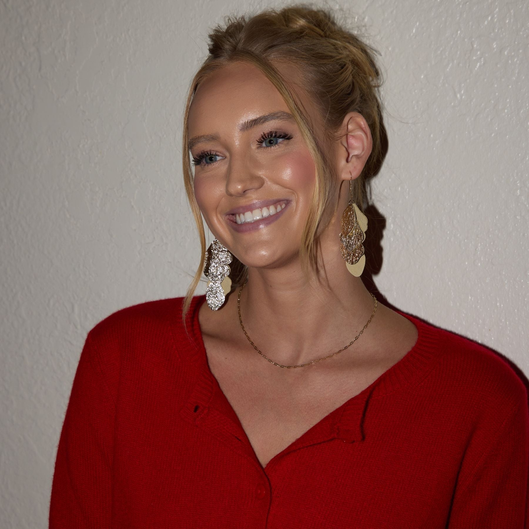 This layered statement earring is designed to be incredibly soft with lots of volume and a subtle sway. Crafted with soft, crushed gold attached to gold chain components, this versatile piece will go with any outfit.
