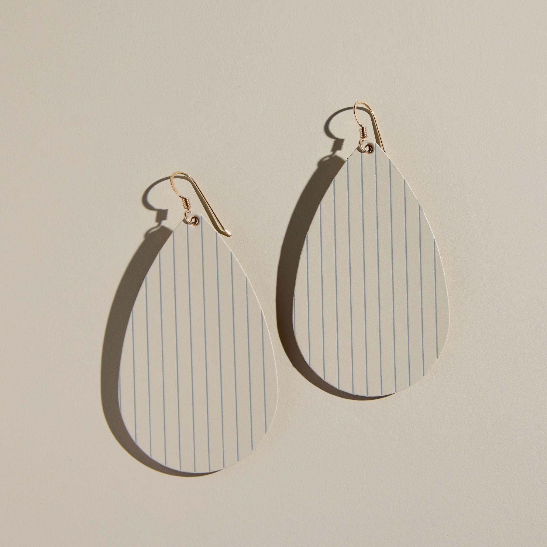 The Ecru Pinstripe Teardrop is a lightweight statement leather earring in our classic teardrop shape. These earrings are made with ecru leather with foiled gray pinstripes creating a bold statement style that adds a classic touch to any outfit.
