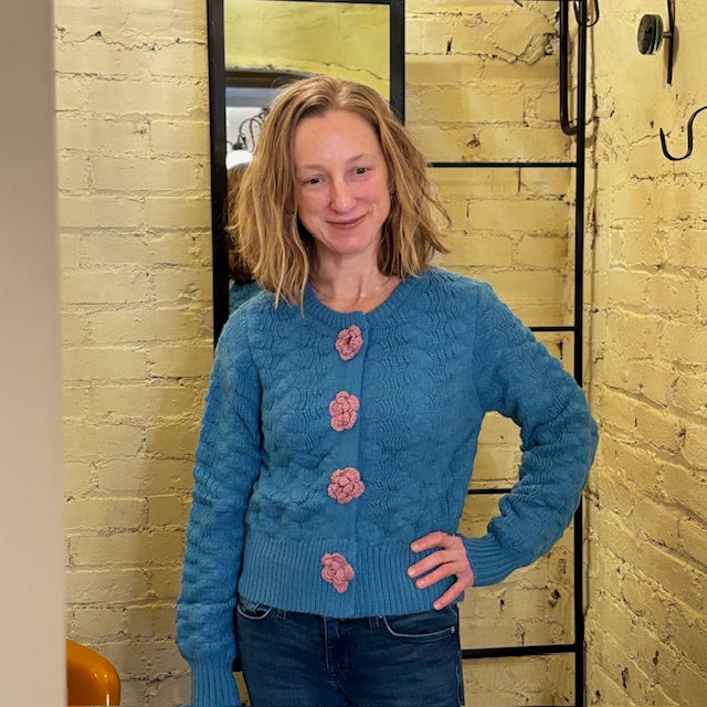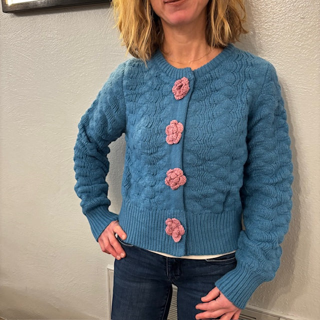 French Blue Textured knit sweater cardigan with knit rosette detail + Long puff sleeves with ribbed cuffs + Knit rosette detail on button down placket + Relaxed fit + Ribbed neckline, cuffs, and hem