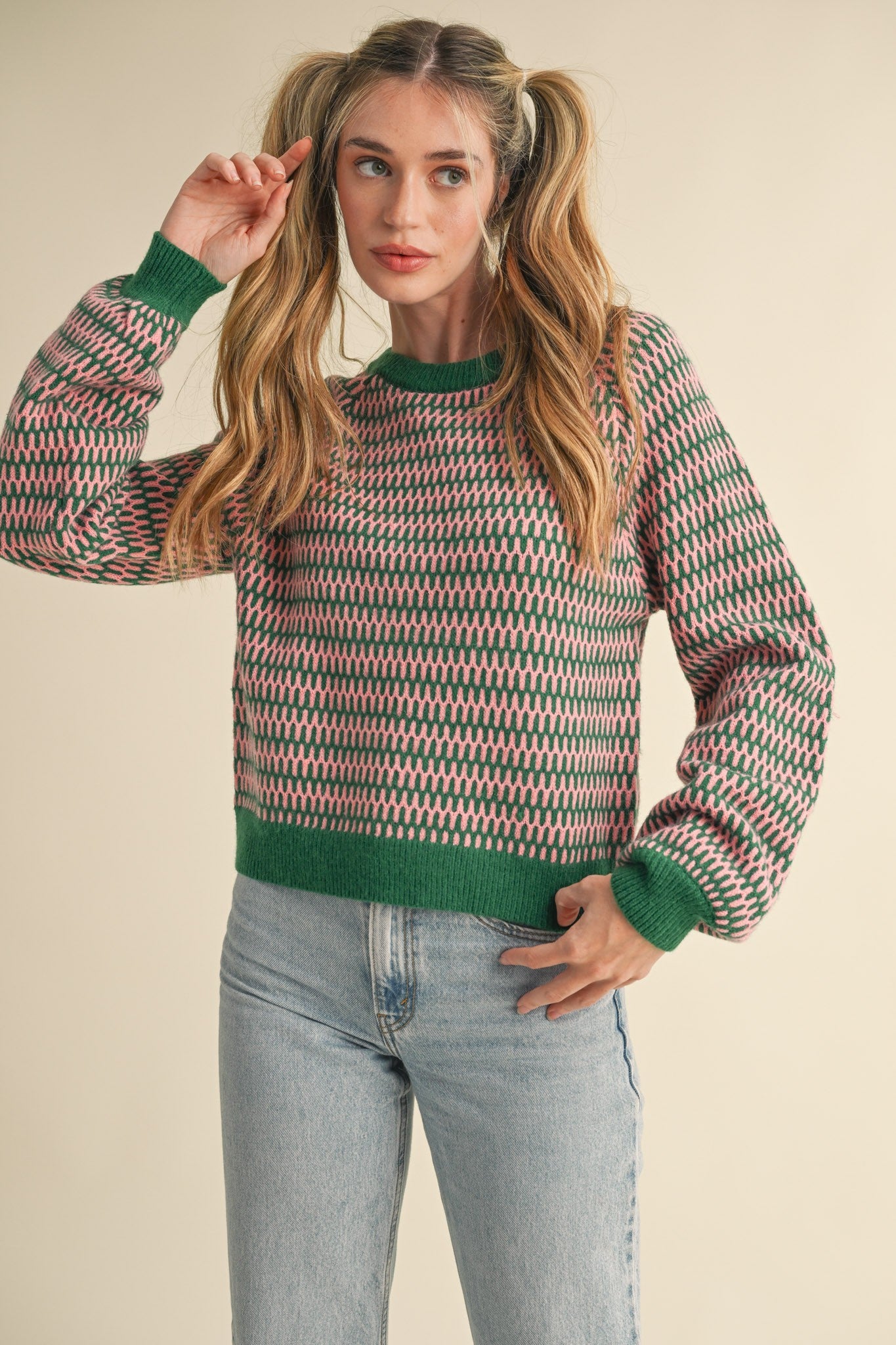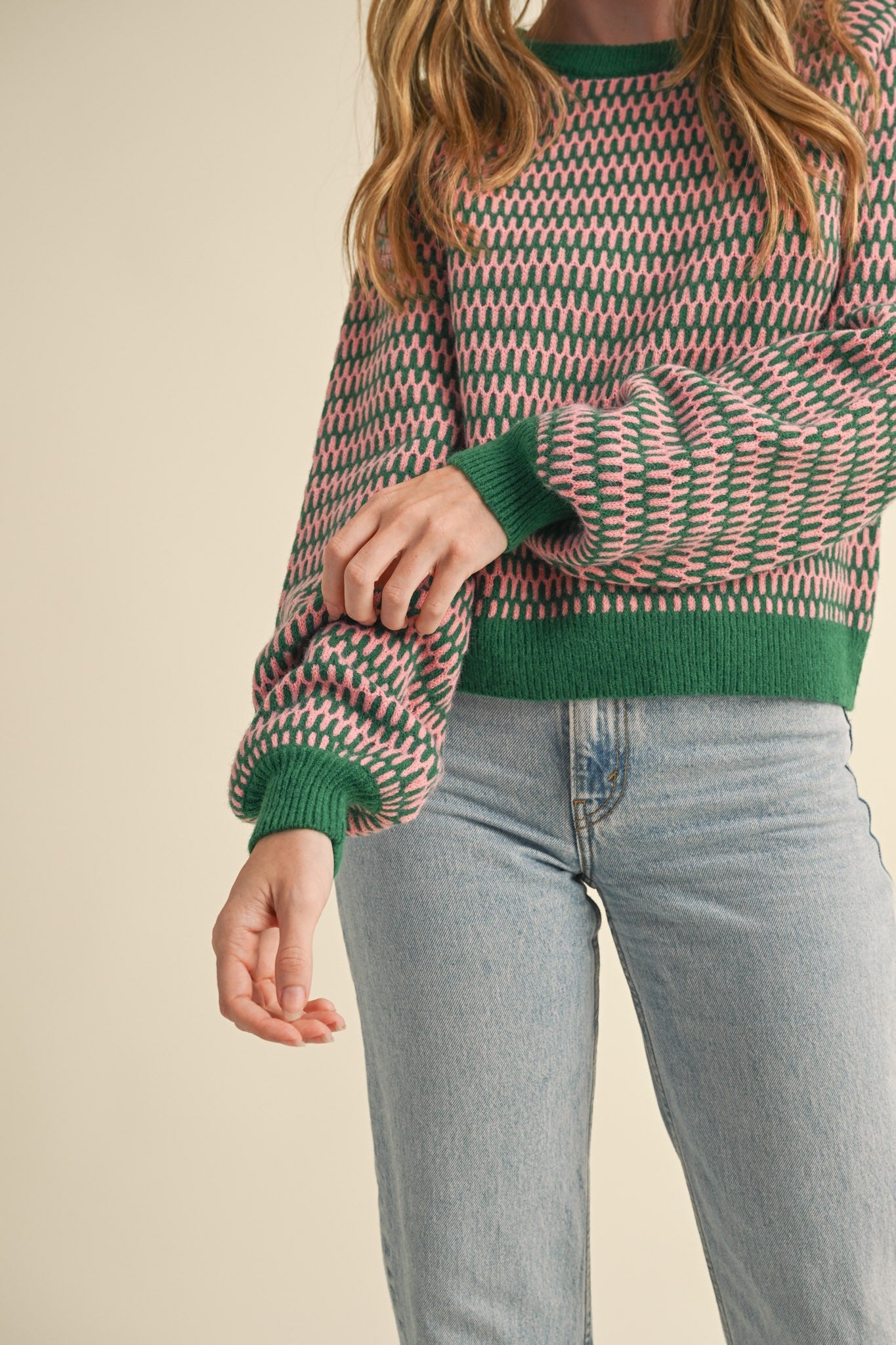 Geometric stripe knit puff sleeve sweater + Round neck + Raglan long puff sleeves + Relaxed fit pullover + Contrast ribbed neckline, cuffs, and hem
