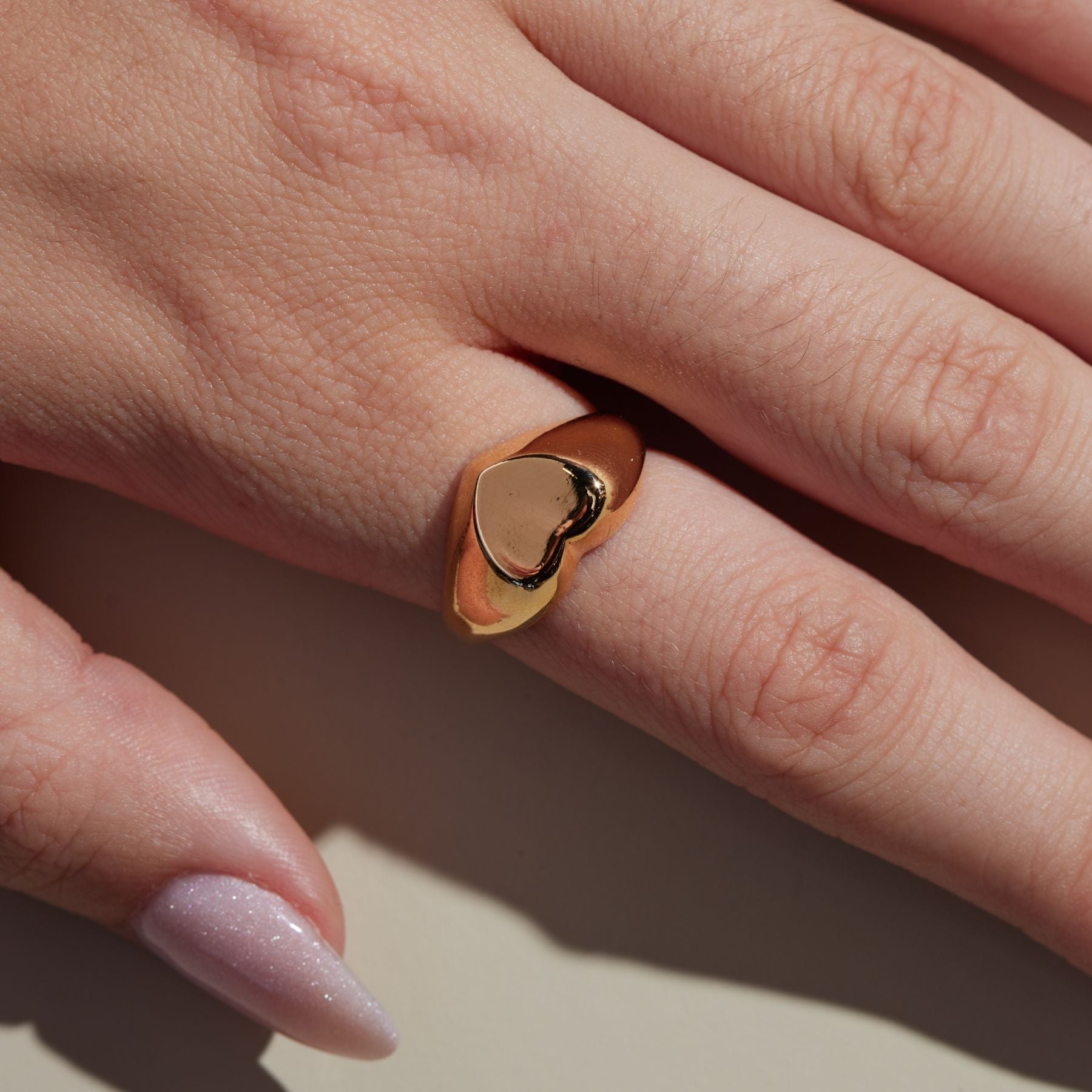 The timeless Girlfriend Signet Ring combines classic sophistication with playful spirit. The curved thick band is molded to a statement heart shape, which offers a refined aesthetic sure to be admired. The 18-karat gold filled ring is electroplate finished to provide a luxe and long-lasting finish, able to withstand water and more!