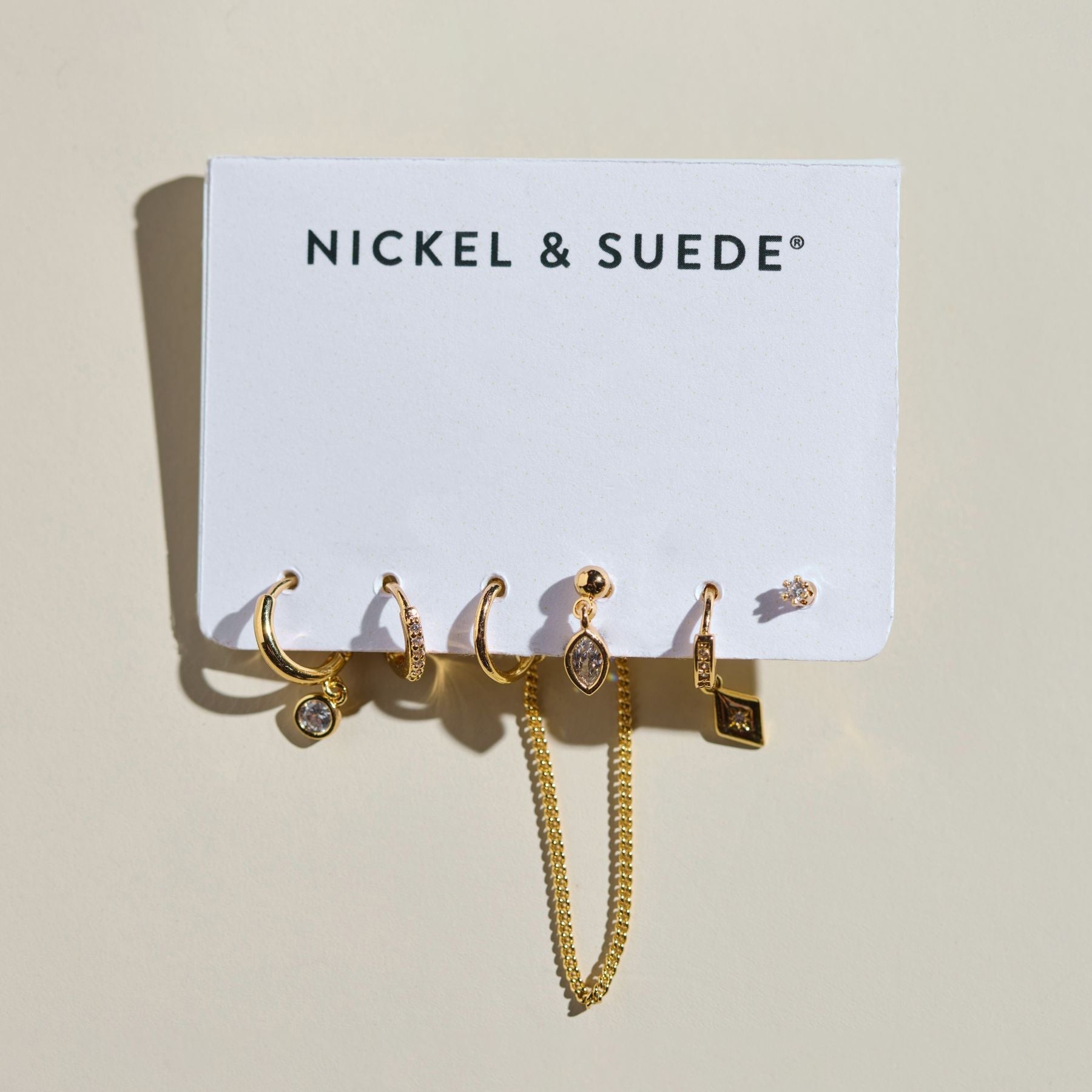 The Assorted Dainty Earrings Set features six pieces, including pave huggies, drop chain studs, and classic studs, all made with waterproof PVD plating. Designed for everyday wear, these earrings are durable, stylish, and perfect for layering or wearing solo. You can wear them all day, even in the shower, without compromising on style. A minimalist, timeless essential for your ear stack.