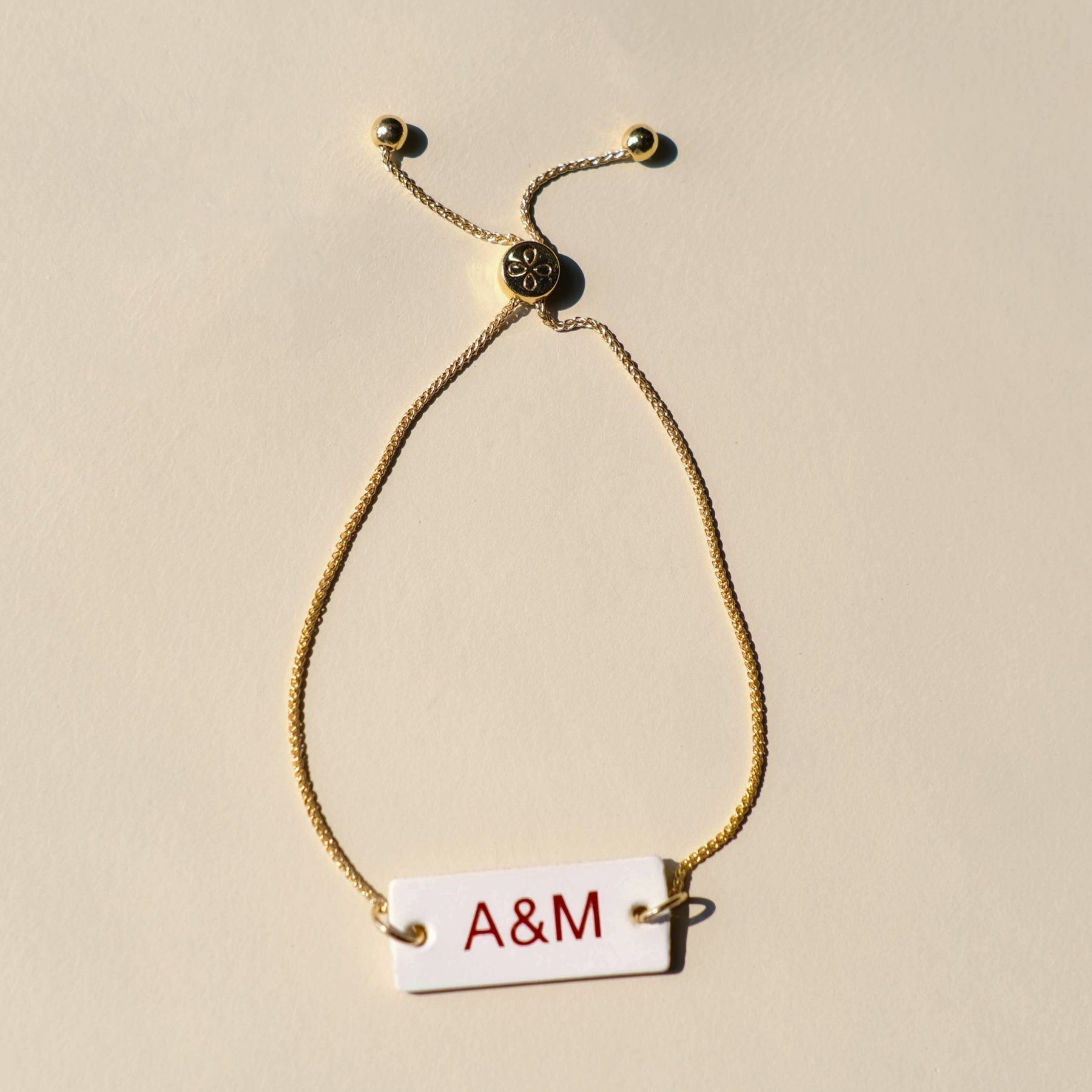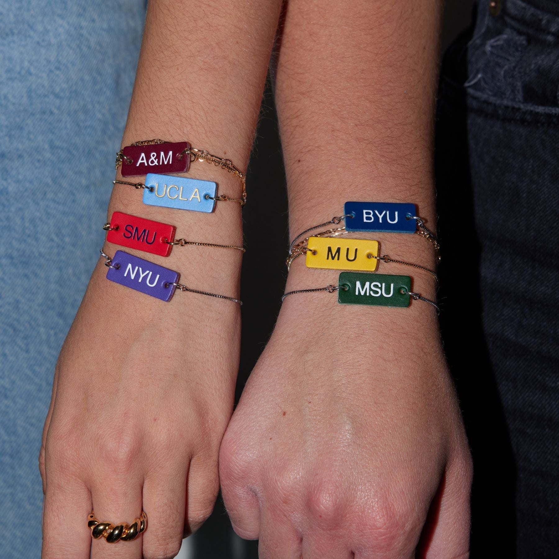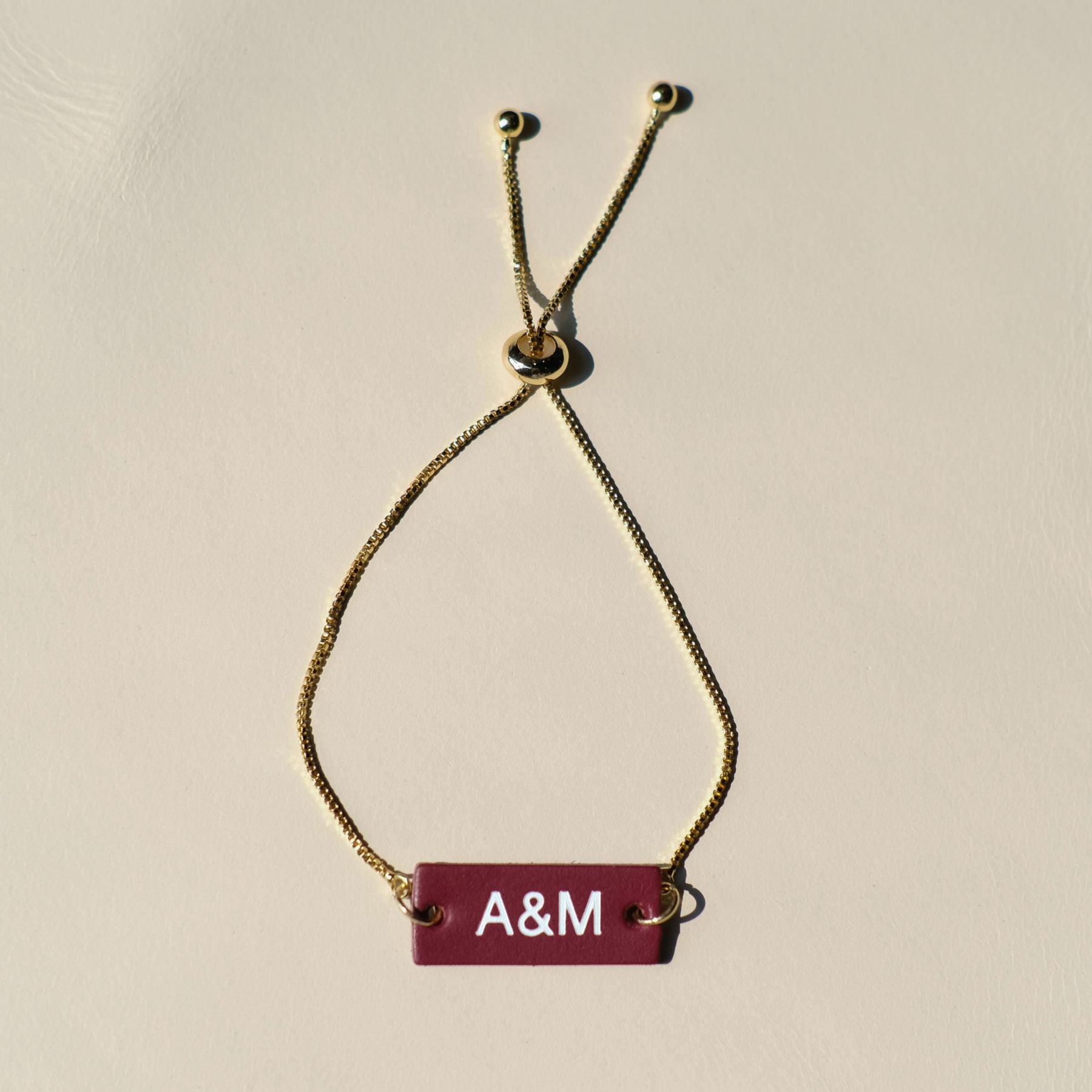 Stand out with the Gold ID Bolo Bracelet! This custom bracelet features a custom monogrammed leather piece, available in gold or silver metal and different options of leather and foil colors. Show off your unique style and express your team spirit in a stylish way!