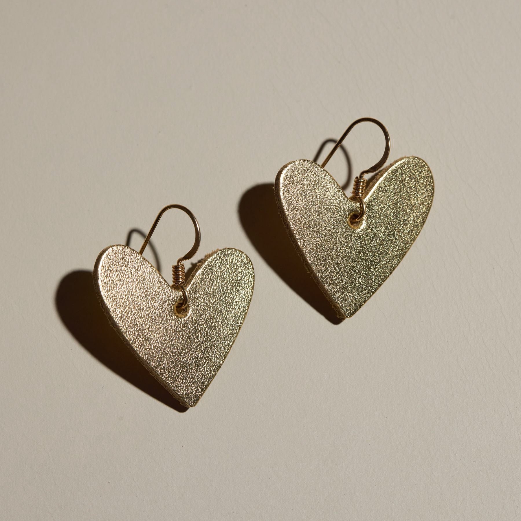 The Minnie is a dainty heart shaped drop earring inspired by our Milas and patented Sweetheart hoop earring design. These lightweight earrings feature Gold Satin leather attached to a gold filled component.