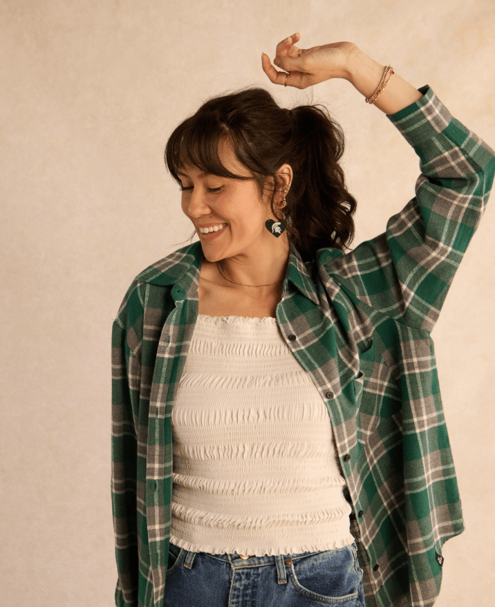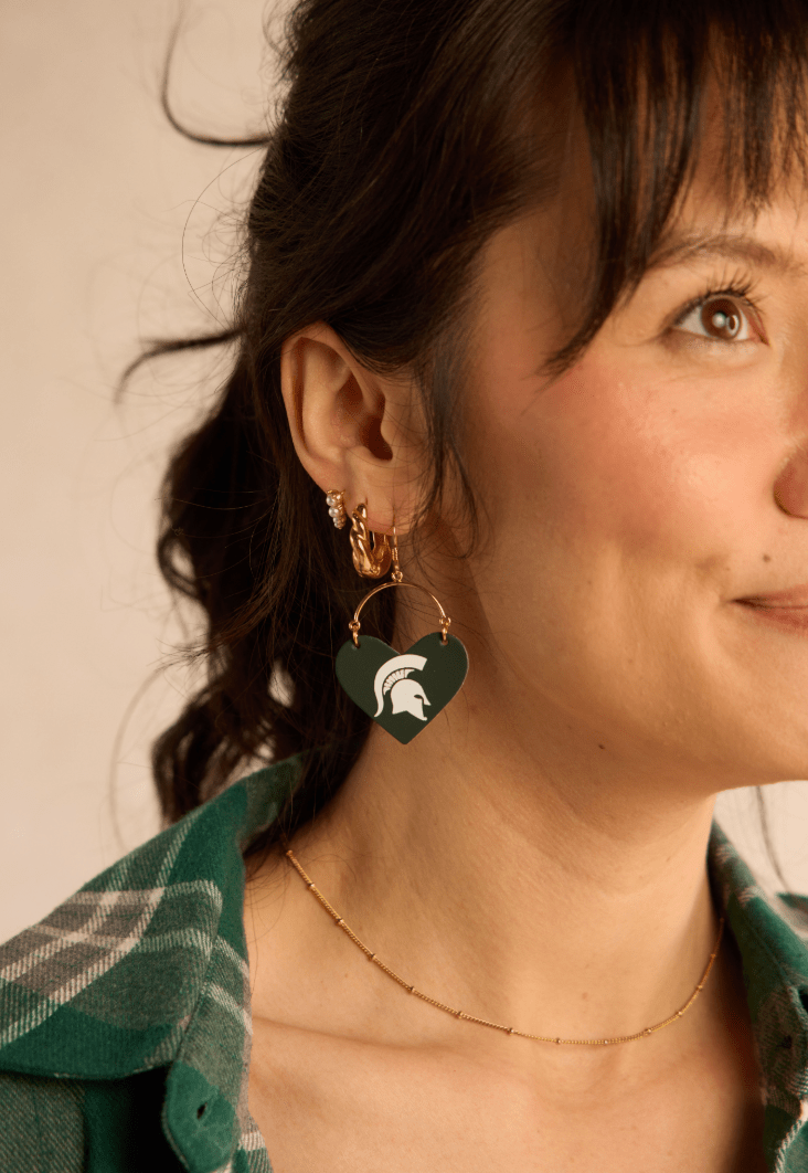 Elevate your gameday look with our Michigan State University Spartan Lover leather earrings - the perfect accessory for passionate fans, proud alumni, and stylish students. These officially licensed earrings are crafted and hand-embossed in Kansas City from premium Italian leather for a standout look.