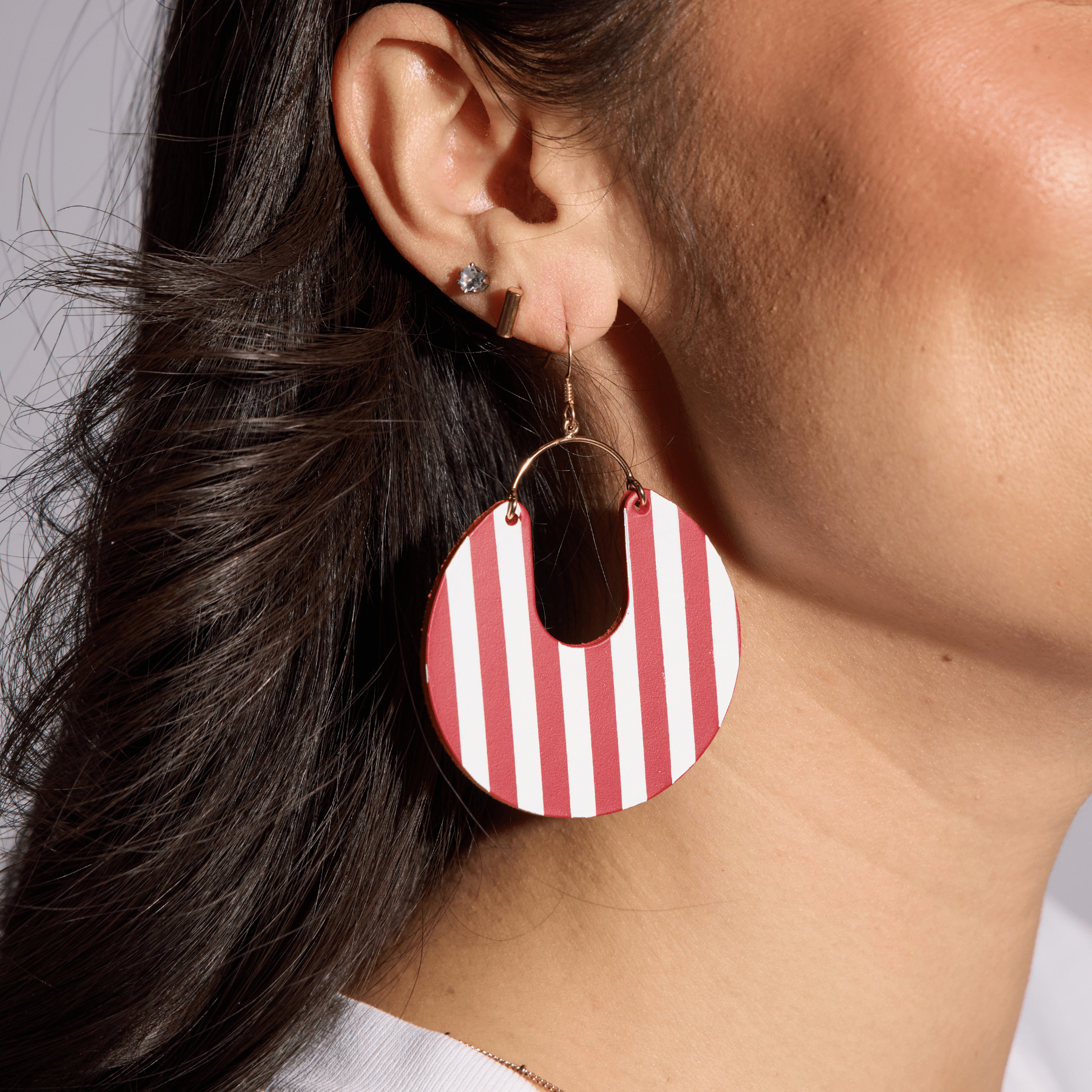 The Leo is a wide, round statement piece with a semi-hollow center. We've supersized our popular Nina shape in this large striped statement style. This style is made of our smooth Indiana Cardinal leather with white hand embossed stripes.