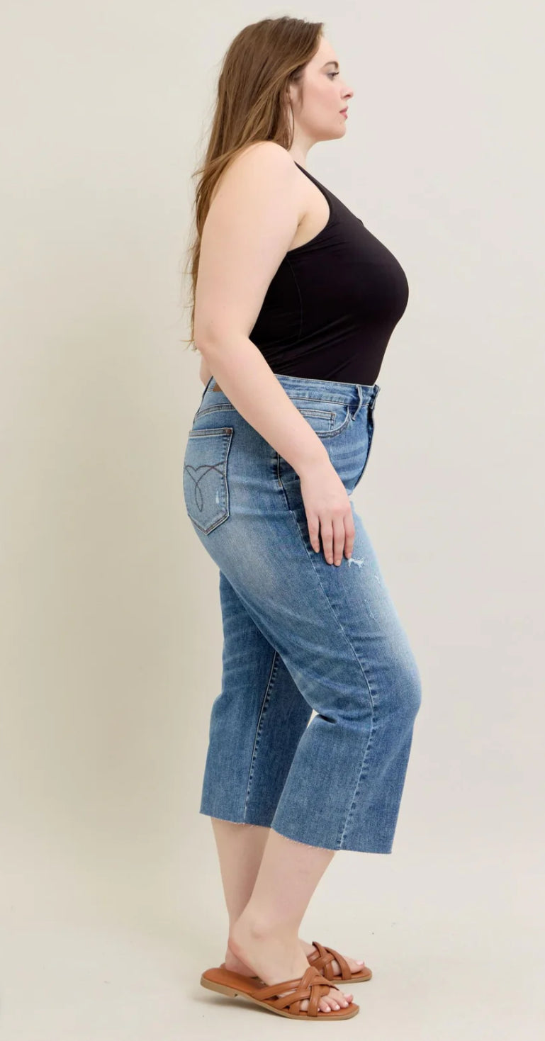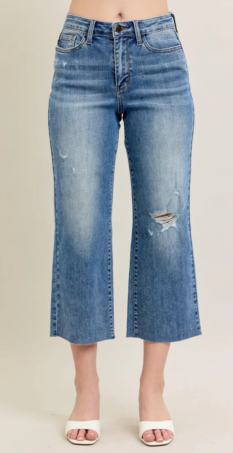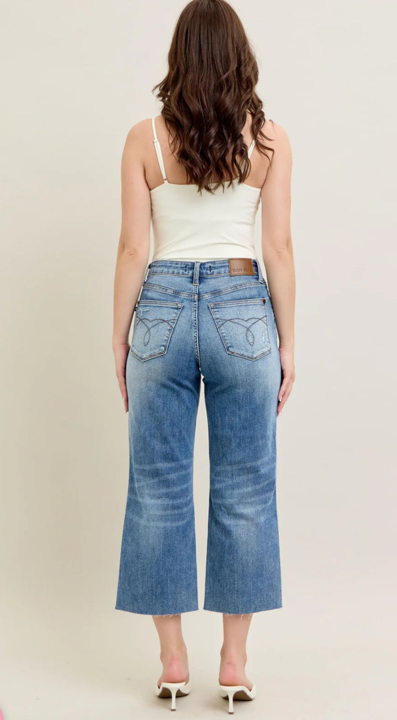 Judy Blue High Waist Pocket Embroidery, Destroy & Raw Cut Hem Wide Crop