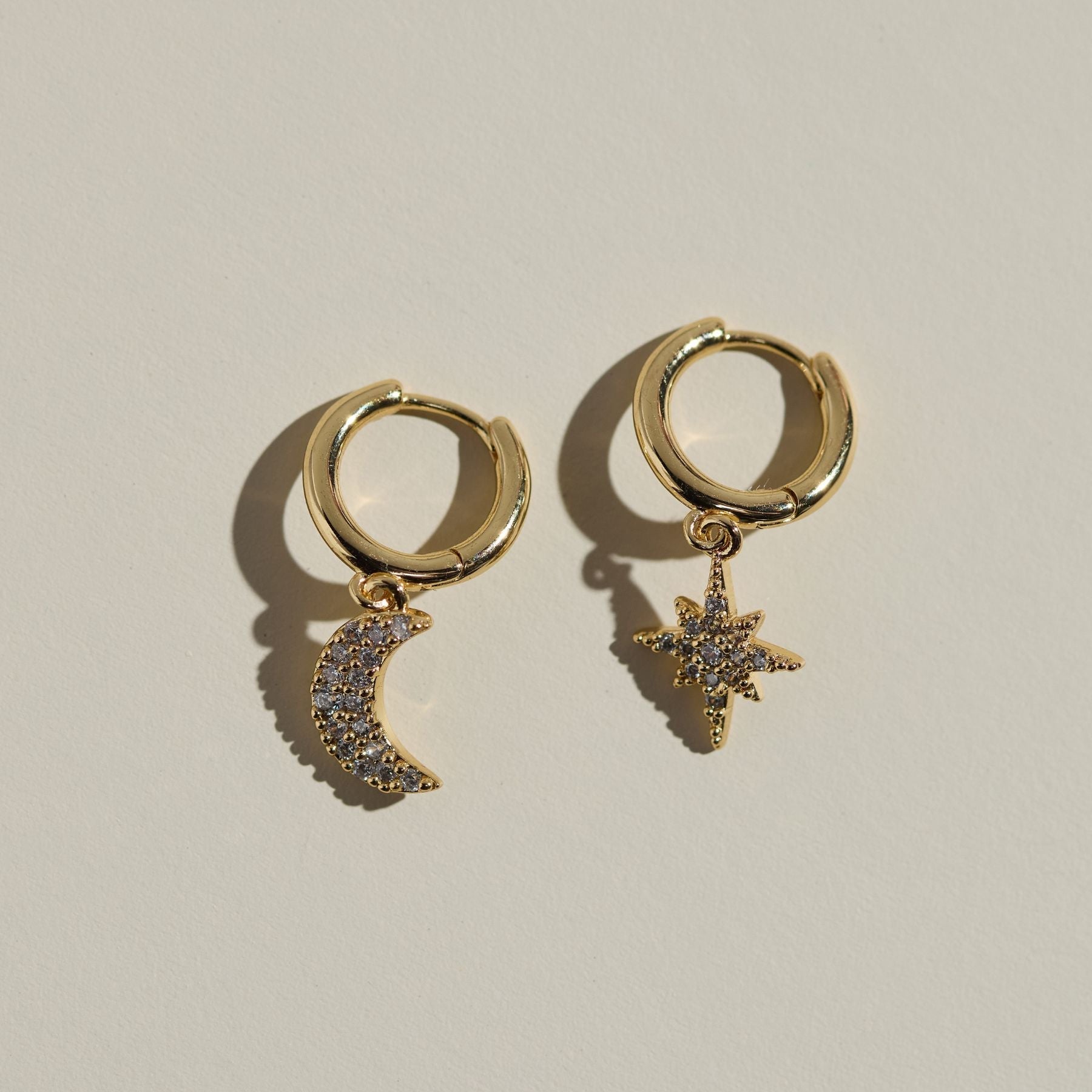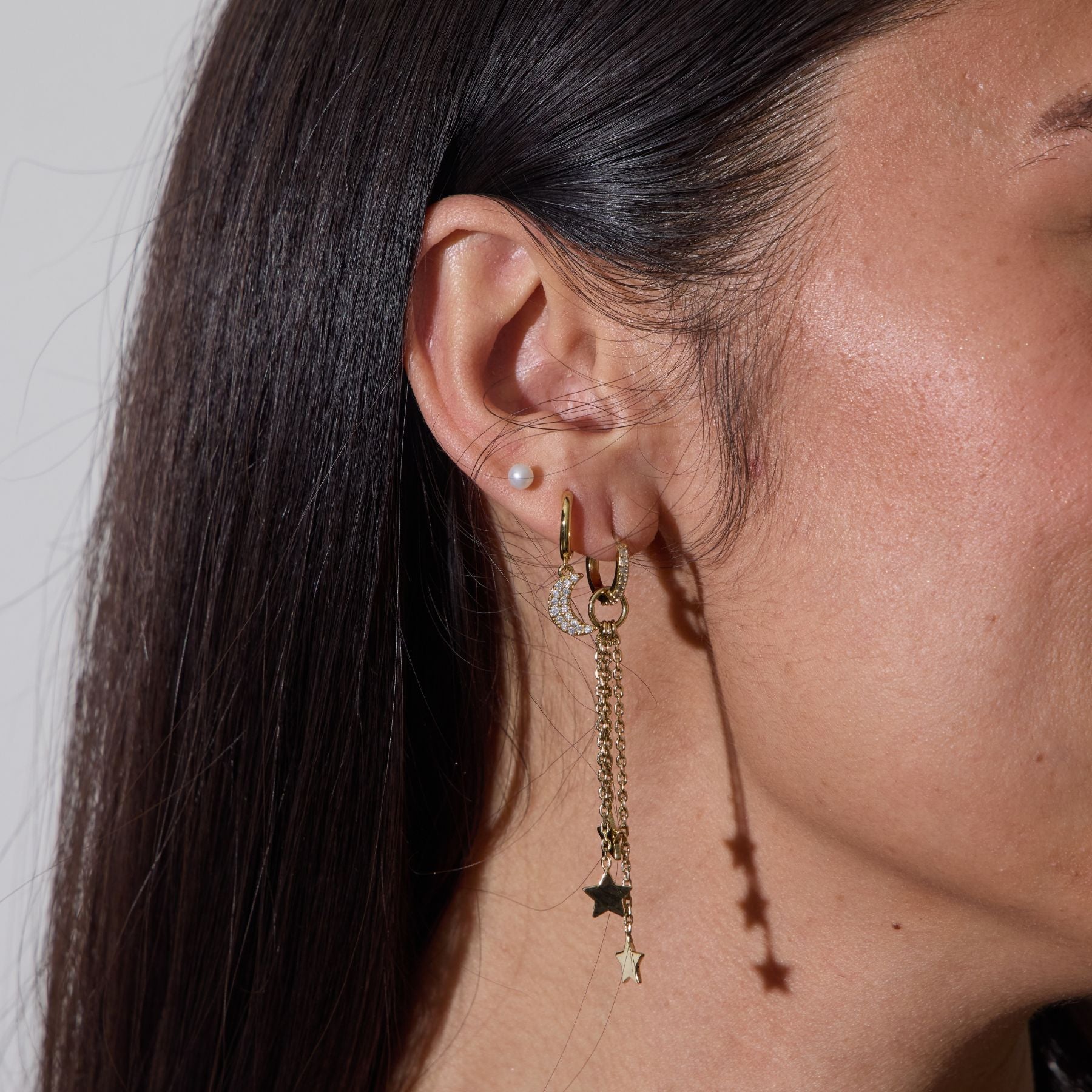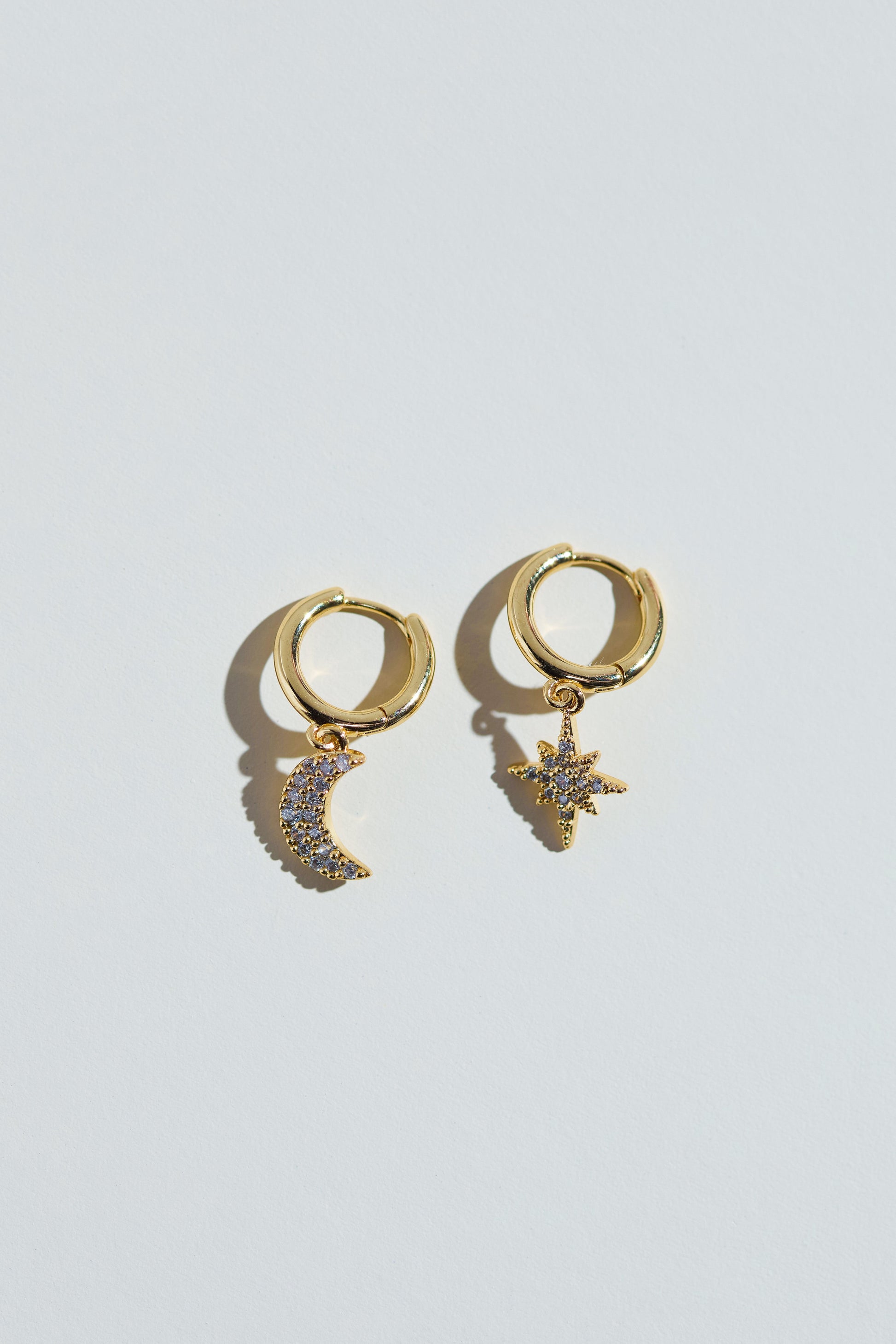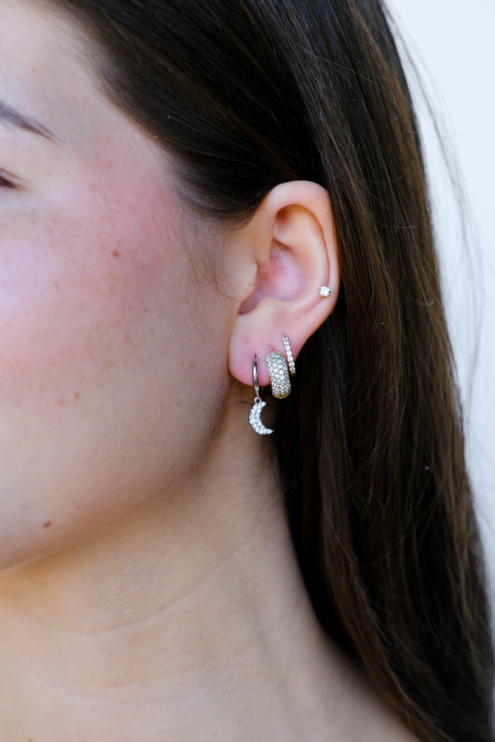 Add an asymmetrical accent to your ear stack! The dainty CZ stone-embellished Moon and Star Huggies bring a charming celestial touch to any look.