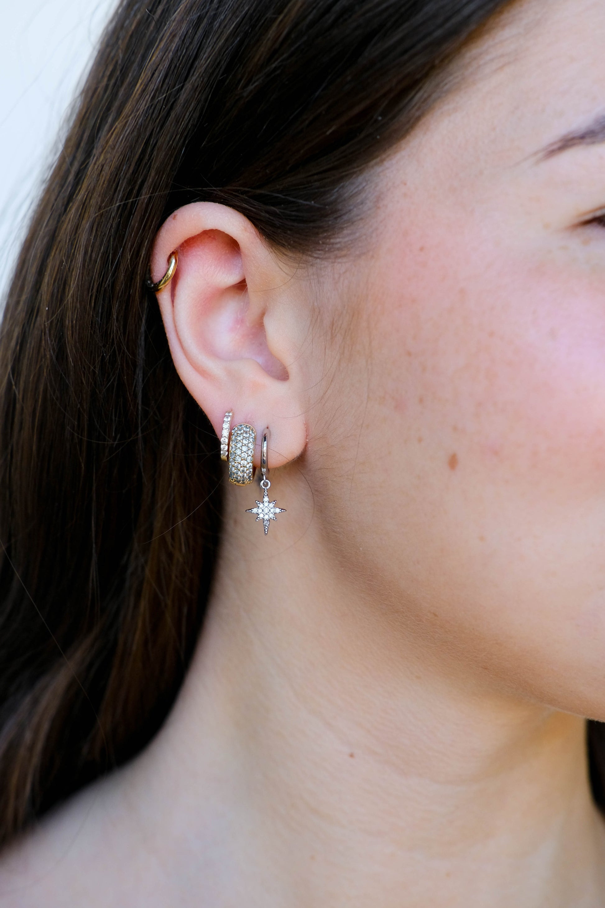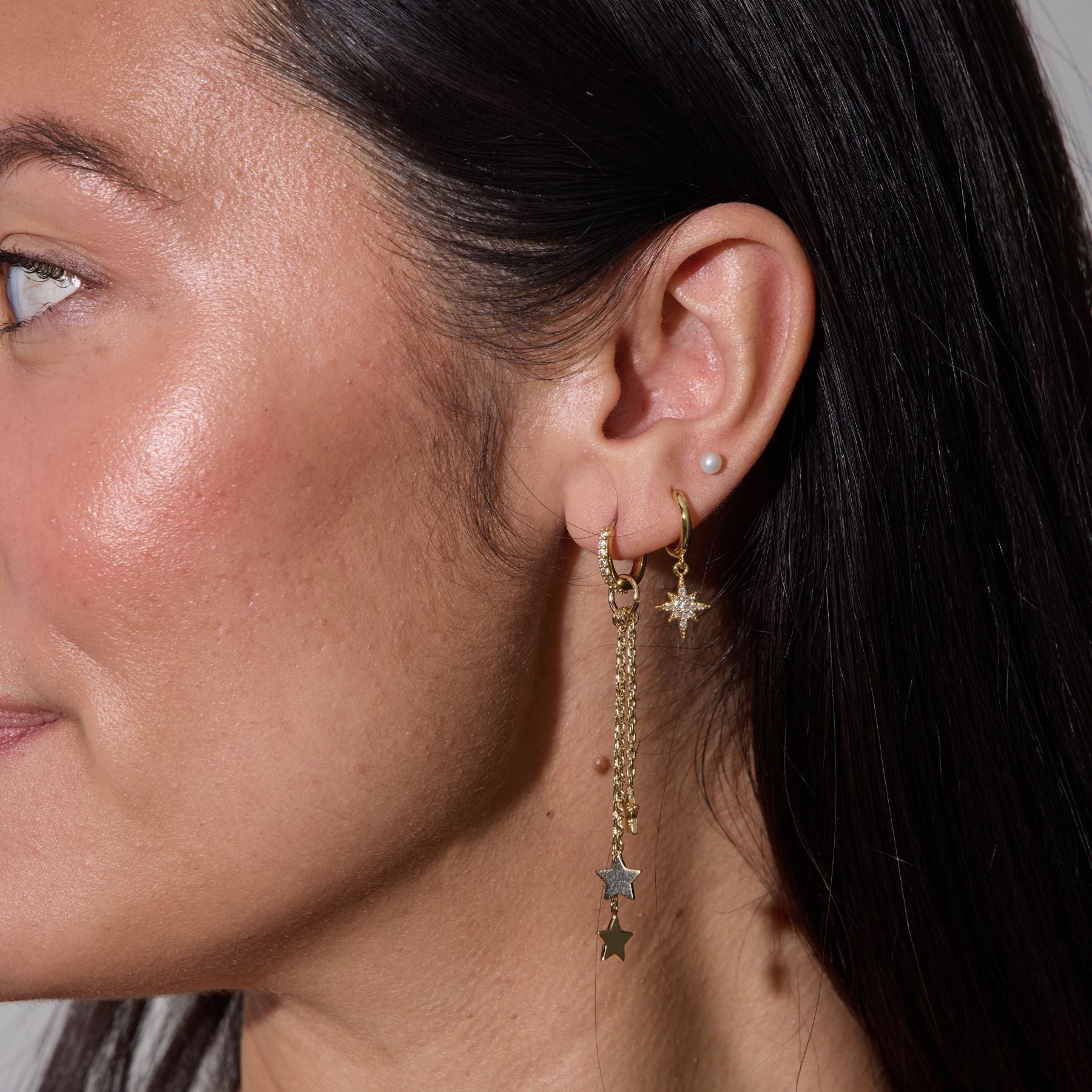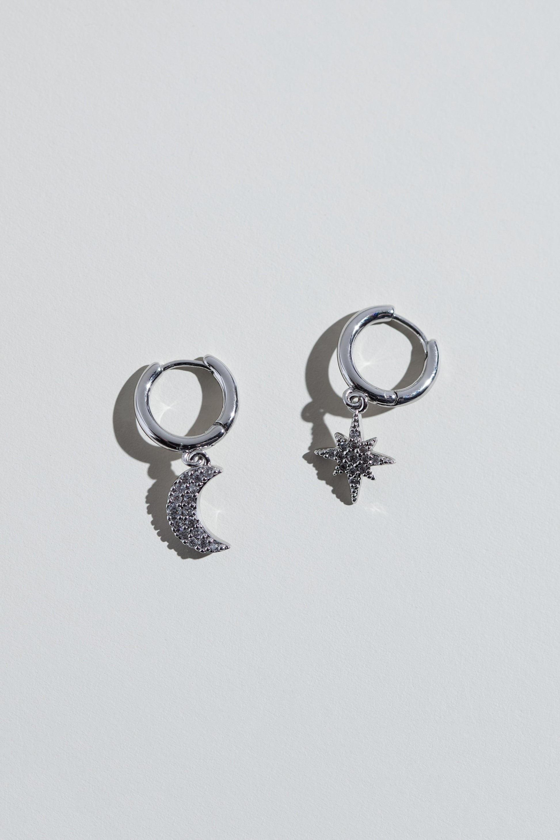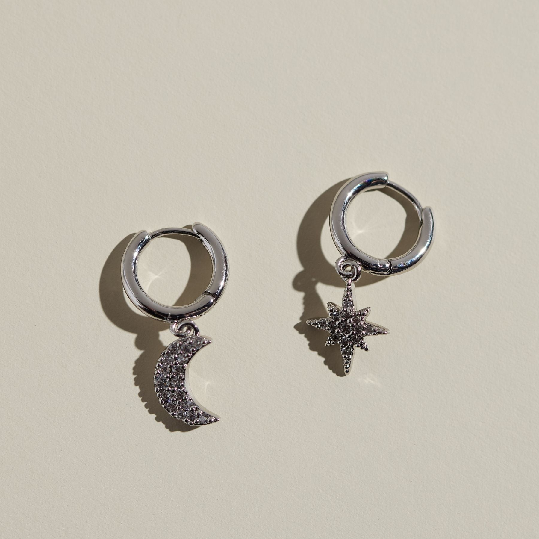 Add an asymmetrical accent to your ear stack! The dainty CZ stone-embellished Moon and Star Huggies bring a charming celestial touch to any look.