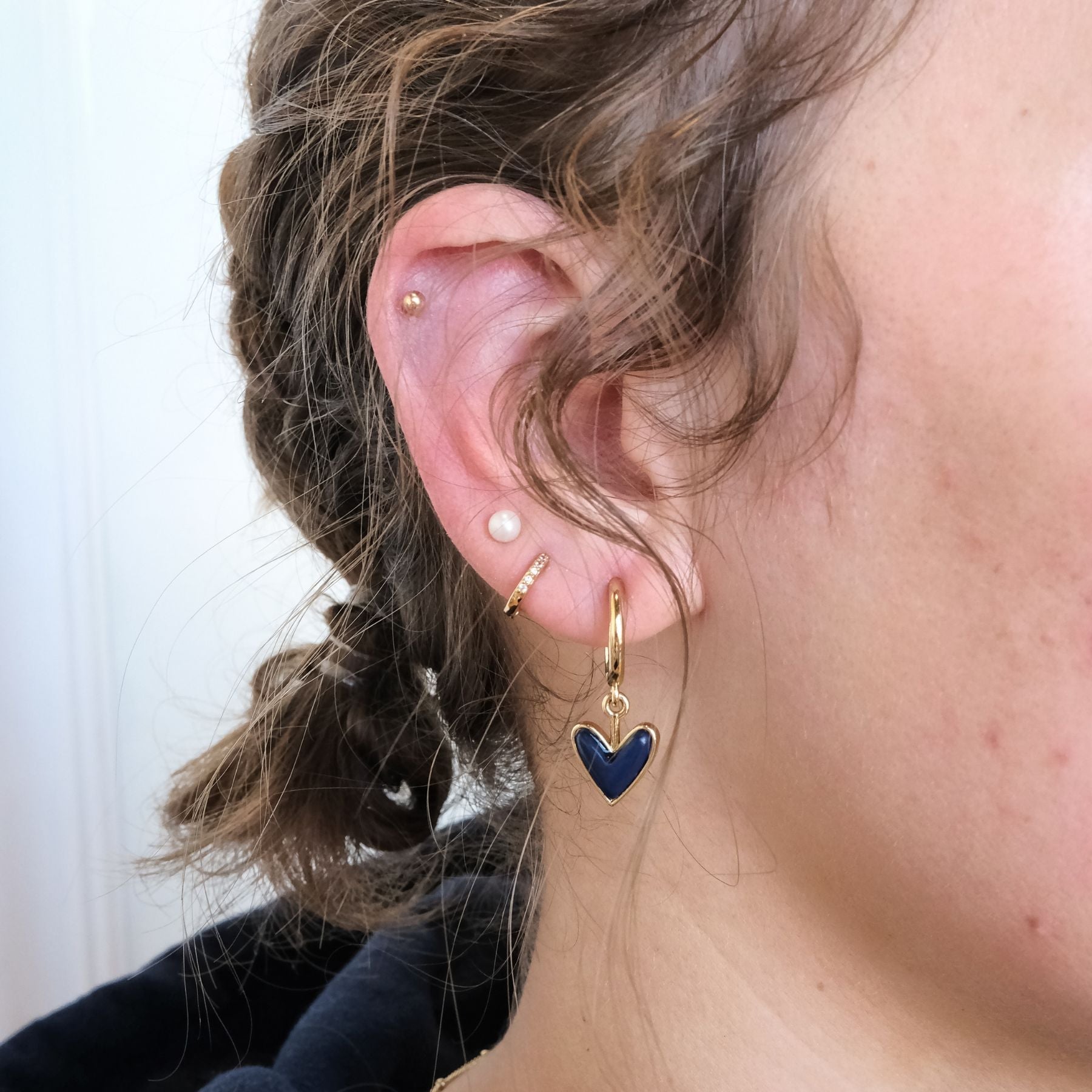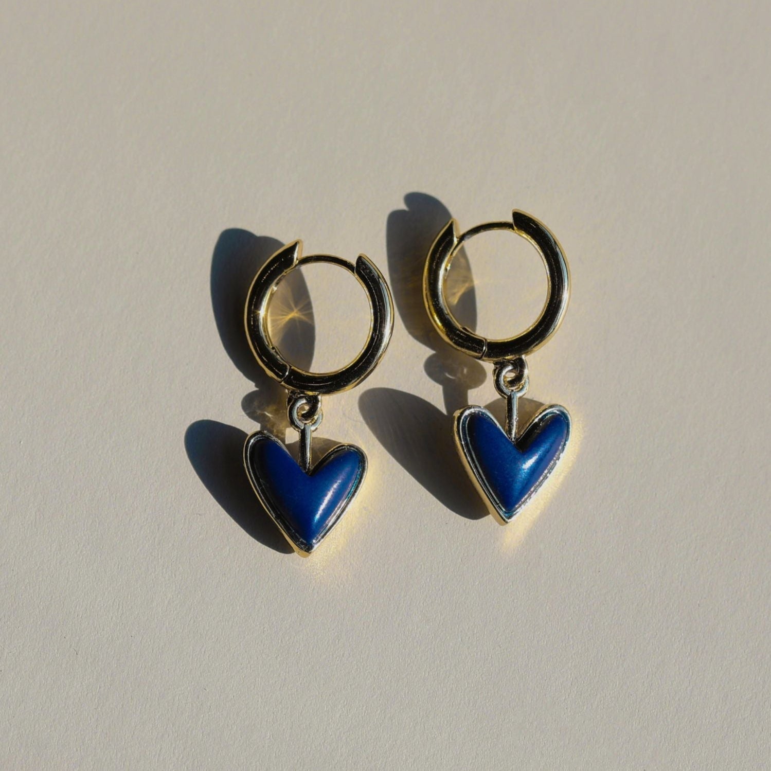 On-trend sweetheart huggies are ideal for mixing and stacking. Inspired by their namesake statement earring, these petite hoops feature a hanging navy stone charm in gold plating over brass with a hinged closure.