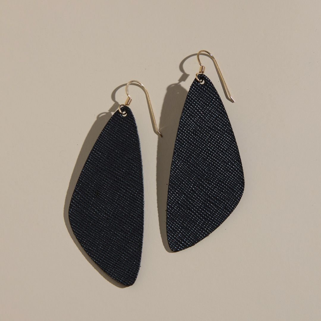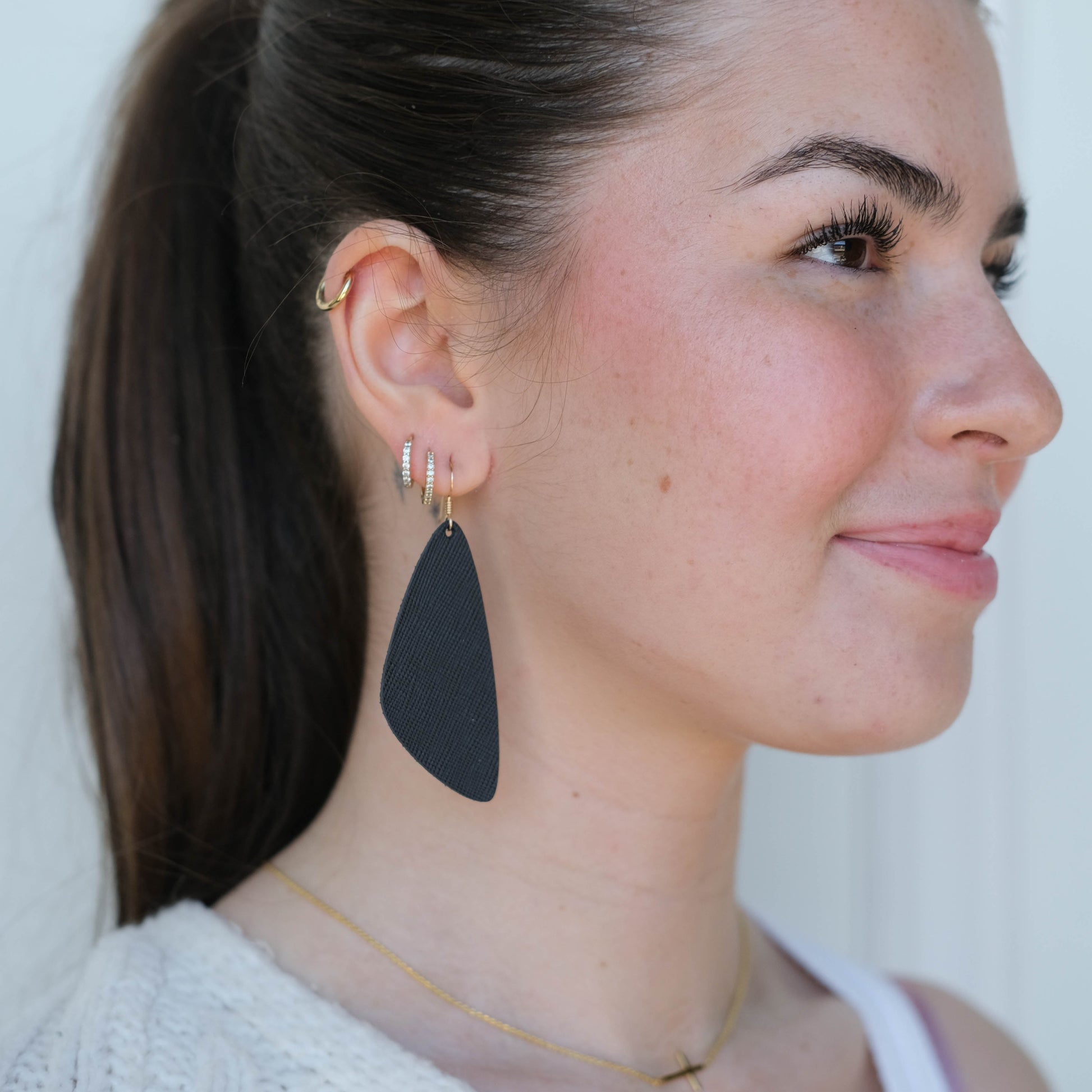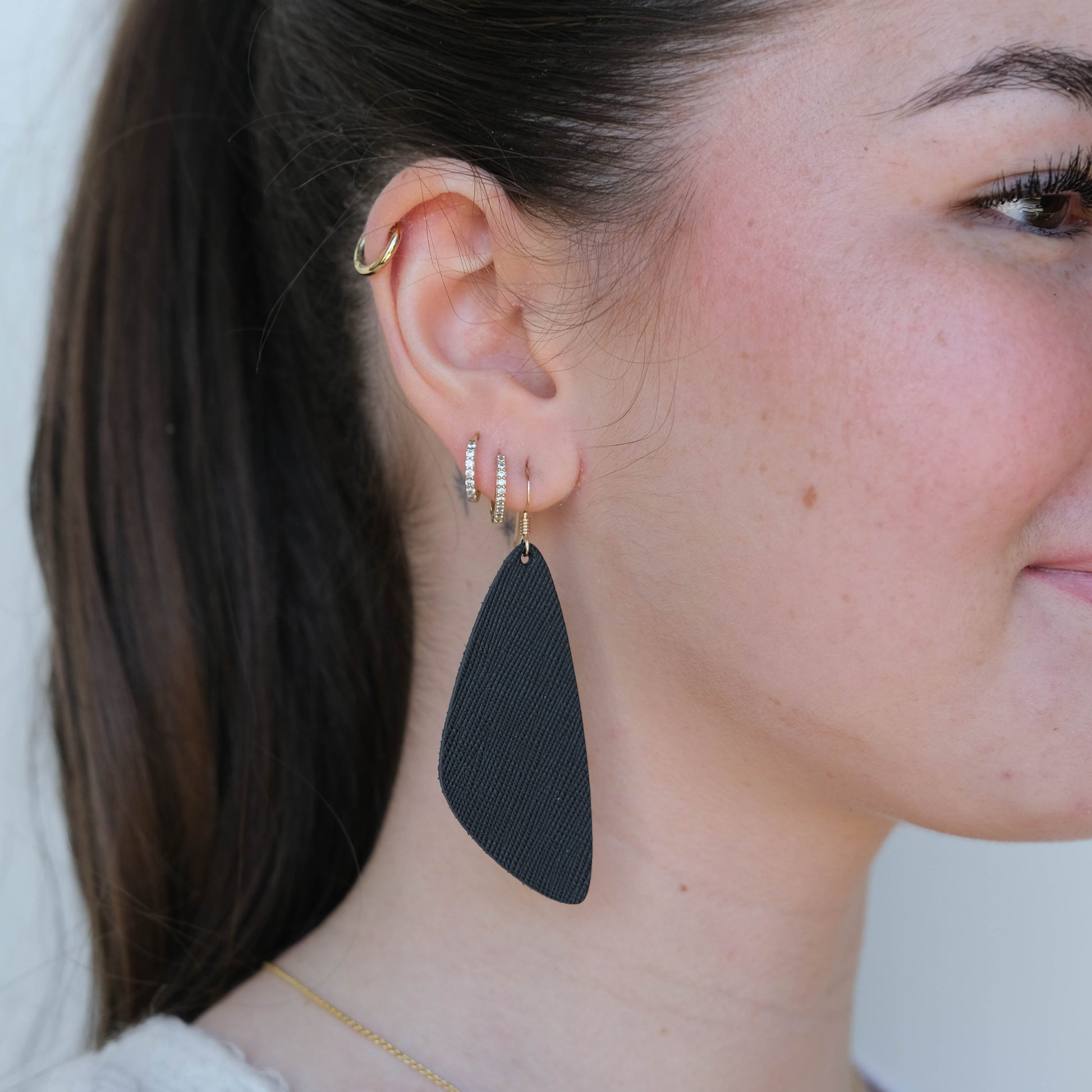 Featuring one of our most loved face-framing shapes, the Onyx Evie statement earrings are crafted with our premium textured Onyx leather to create a dangling drop earring. The dark neutral leather and 14k gold hardware make this statement earring a lightweight staple.