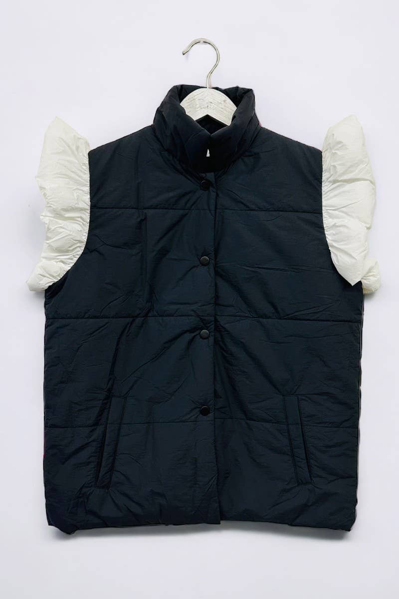 Stay warm and cozy in this ruffle trim 2 tone puffer vest for the fall season. Great item to throw on for game day, bbq, parties, sorority rush, tailgates, tailgate, date night, back to school, holidays, halloween, thanksgiving, birthday, mardi gras or brunch