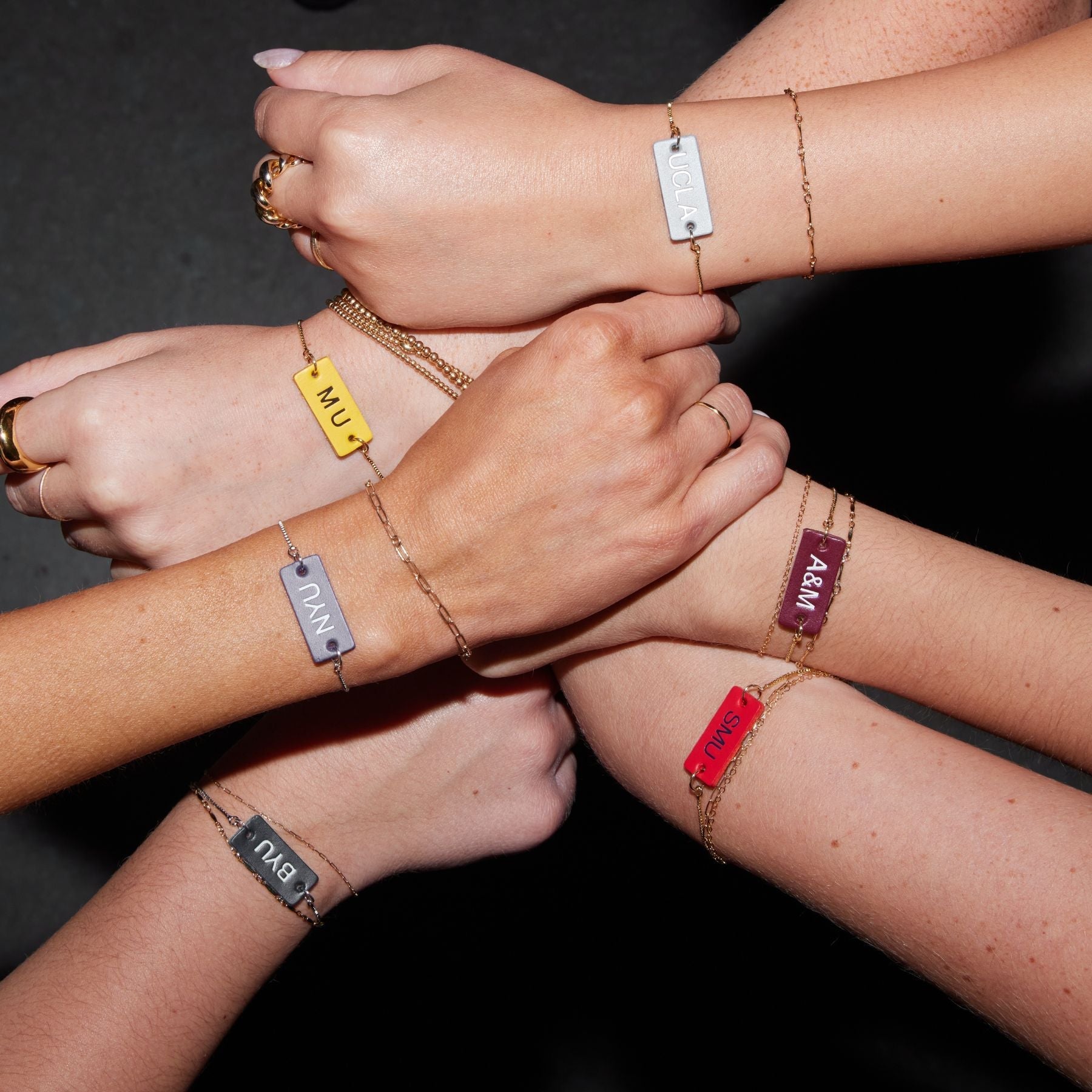Stand out with the Silver ID Bolo Bracelet! This custom bracelet features a custom monogrammed leather piece, available in gold or silver metal and different options of leather and foil colors. Show off your unique style and express your team spirit in a stylish way!