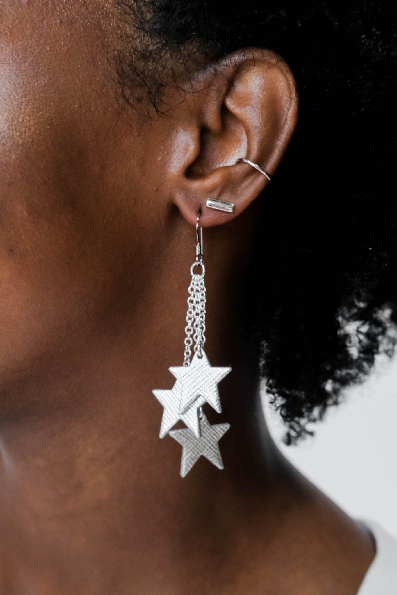 The Silver Leaf Juno is a whimsical star earring made of our signature metallic Silver Leaf leather attached to silver chains. These fun earrings will be the star of your outfit!