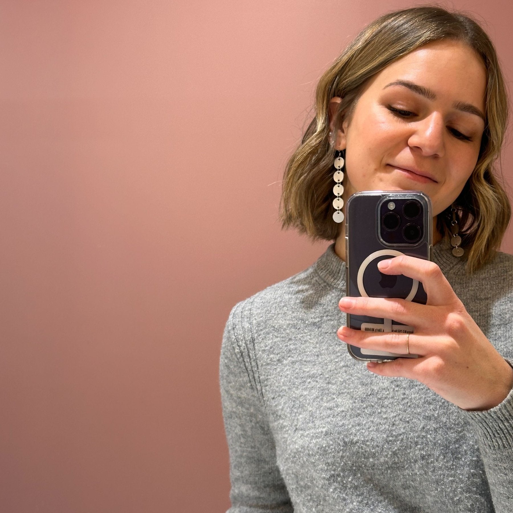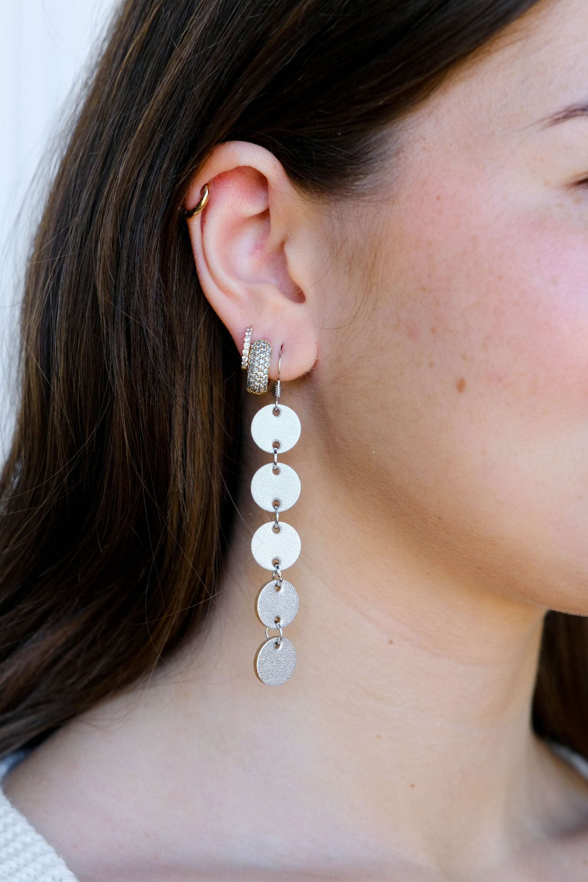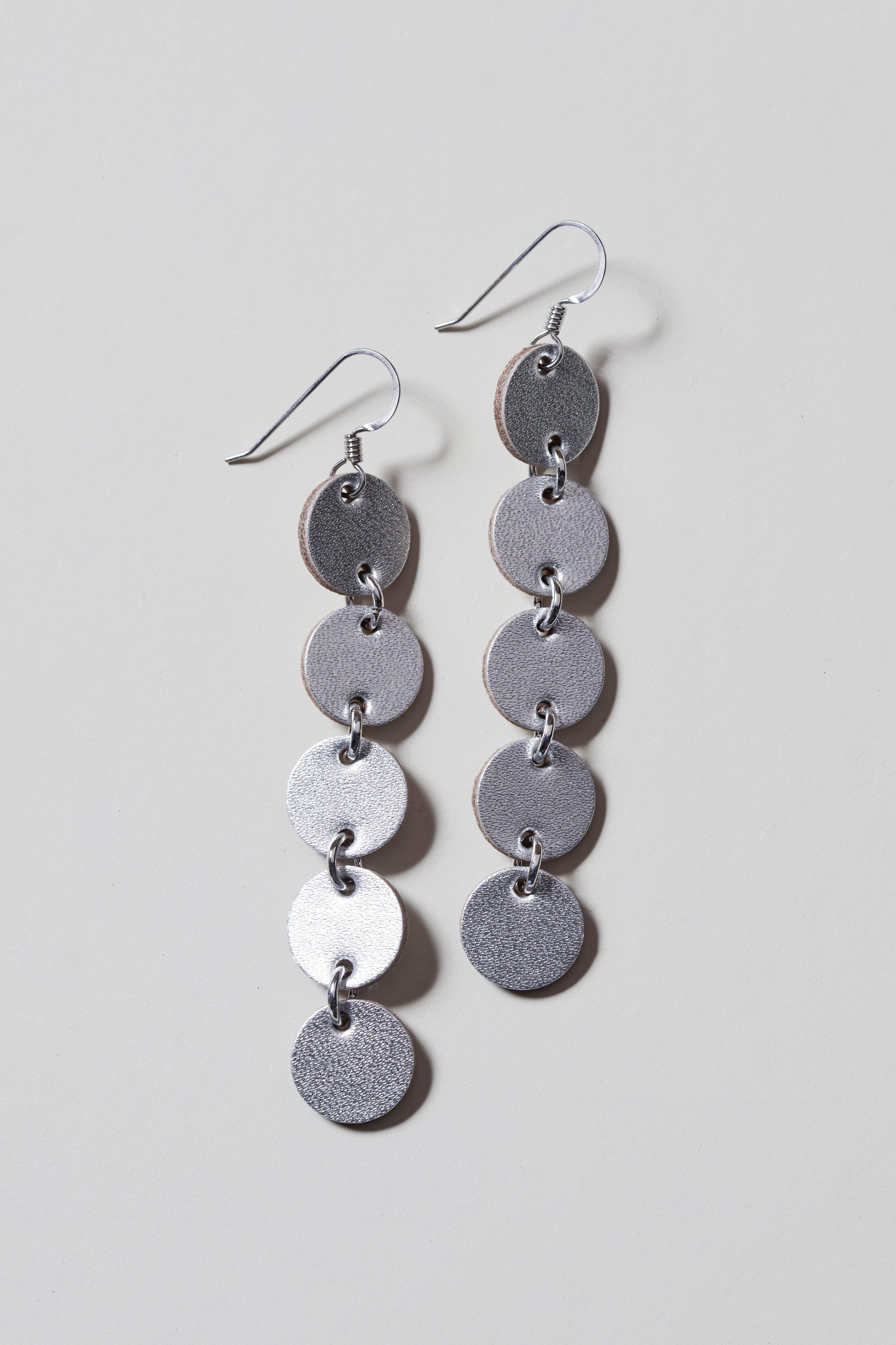 Made with our silver satin leather, the Silver Satin Sylvie Sequin is the statement earring for all. With its tiered sequin shape that shimmer in the light, this lightweight earring is a beauty within itself and adds the perfect touch for that highlighted accessory.