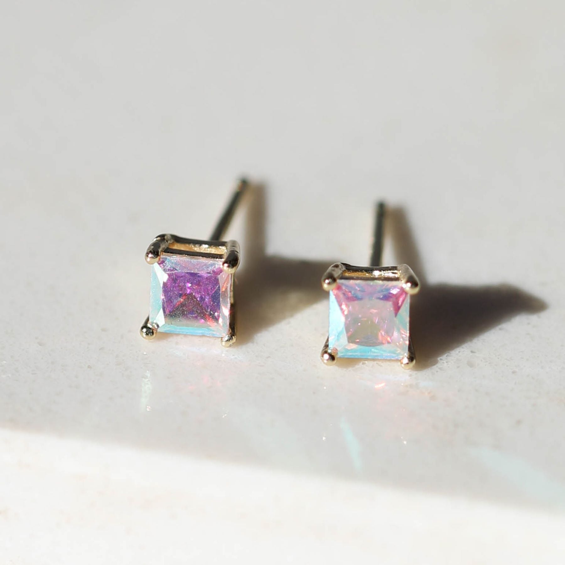 This zircon stone is known for its shimmering iridescence and vibrant color play, which makes it a beautiful stone for earrings. These studs feature vermeil plating for long-lasting wear.
