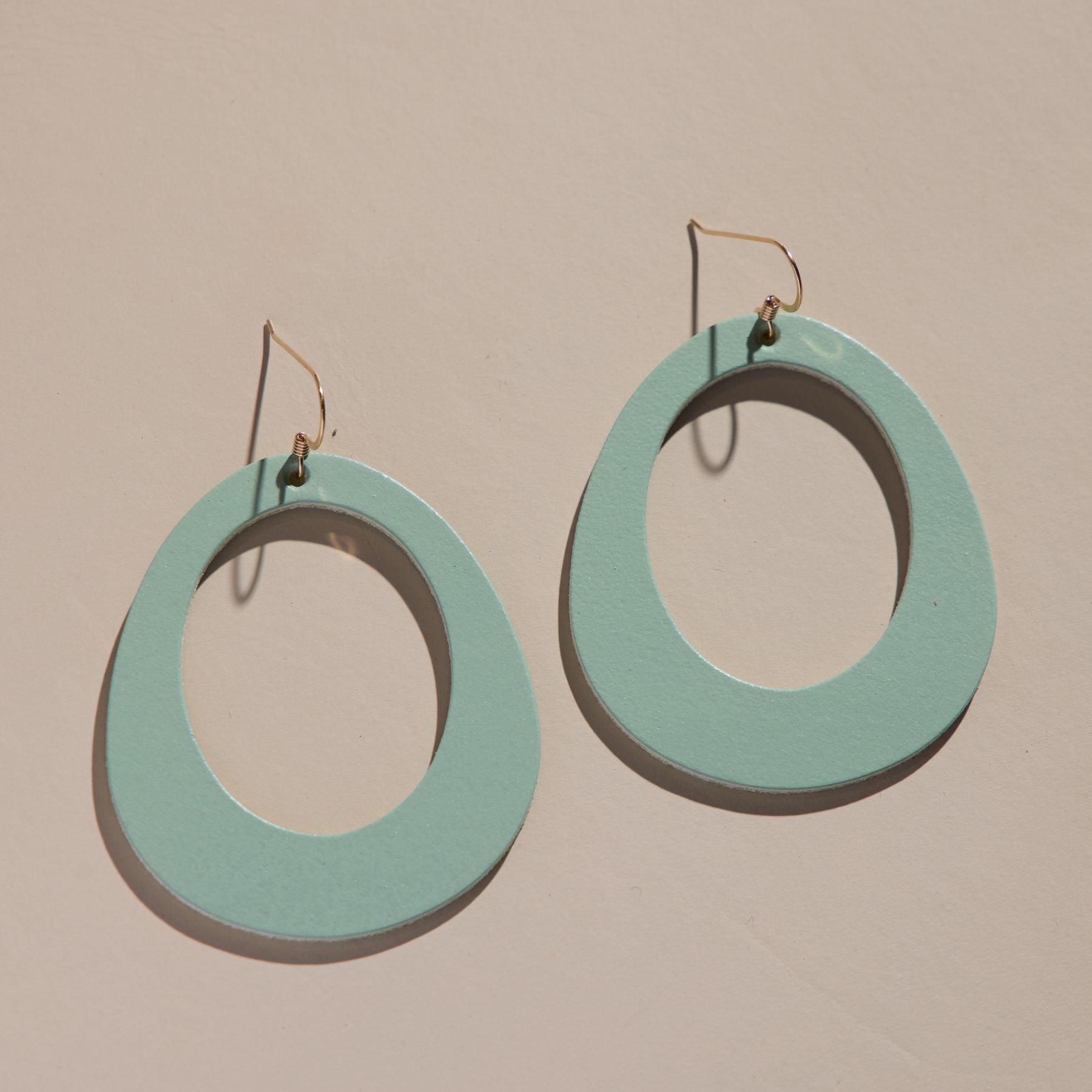 These lightweight leather statement earrings feature our signature Sweethearts shape and versatile smooth spearmint leather. The smooth texture of this blueish green-toned leather gives off a slight matte hue and captures the light beautifully.