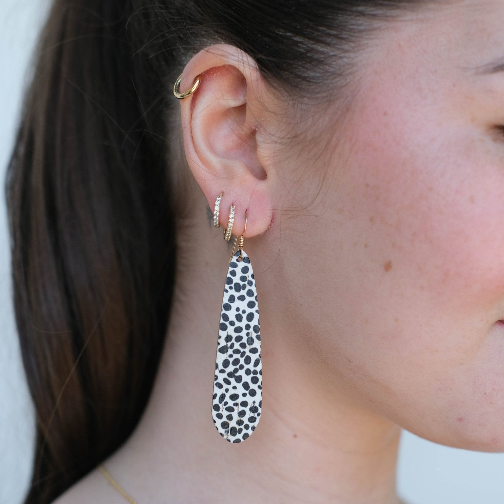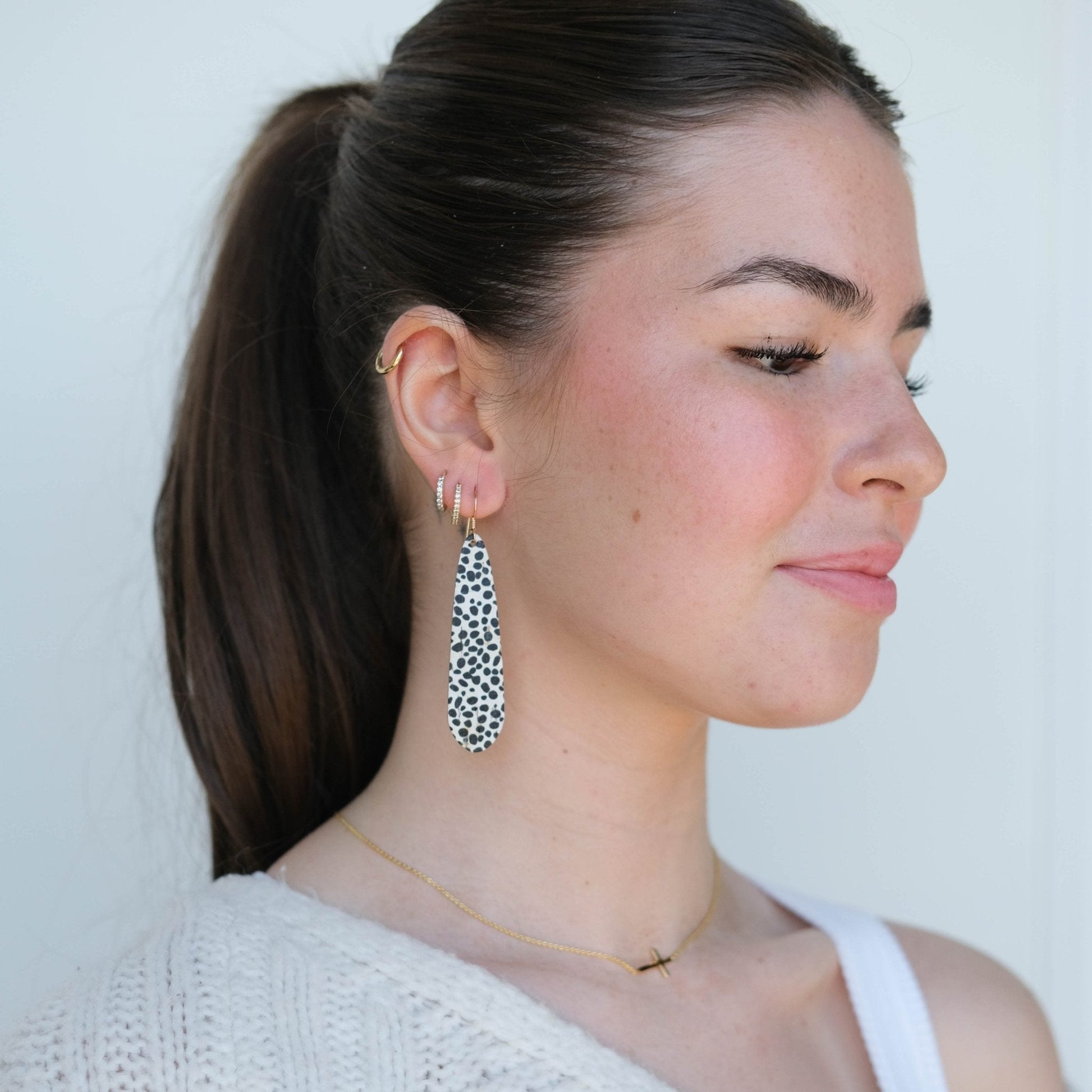 Featuring a lightweight, slim, face-framing silhouette, the Speckled Cork Lilas are crafted with our premium Italian leather in Speckled Cork, offering an elegant touch of chic to your everyday look. Whether you’re dressing up for a night out or keeping it casual, these earrings are the perfect finishing touch.
