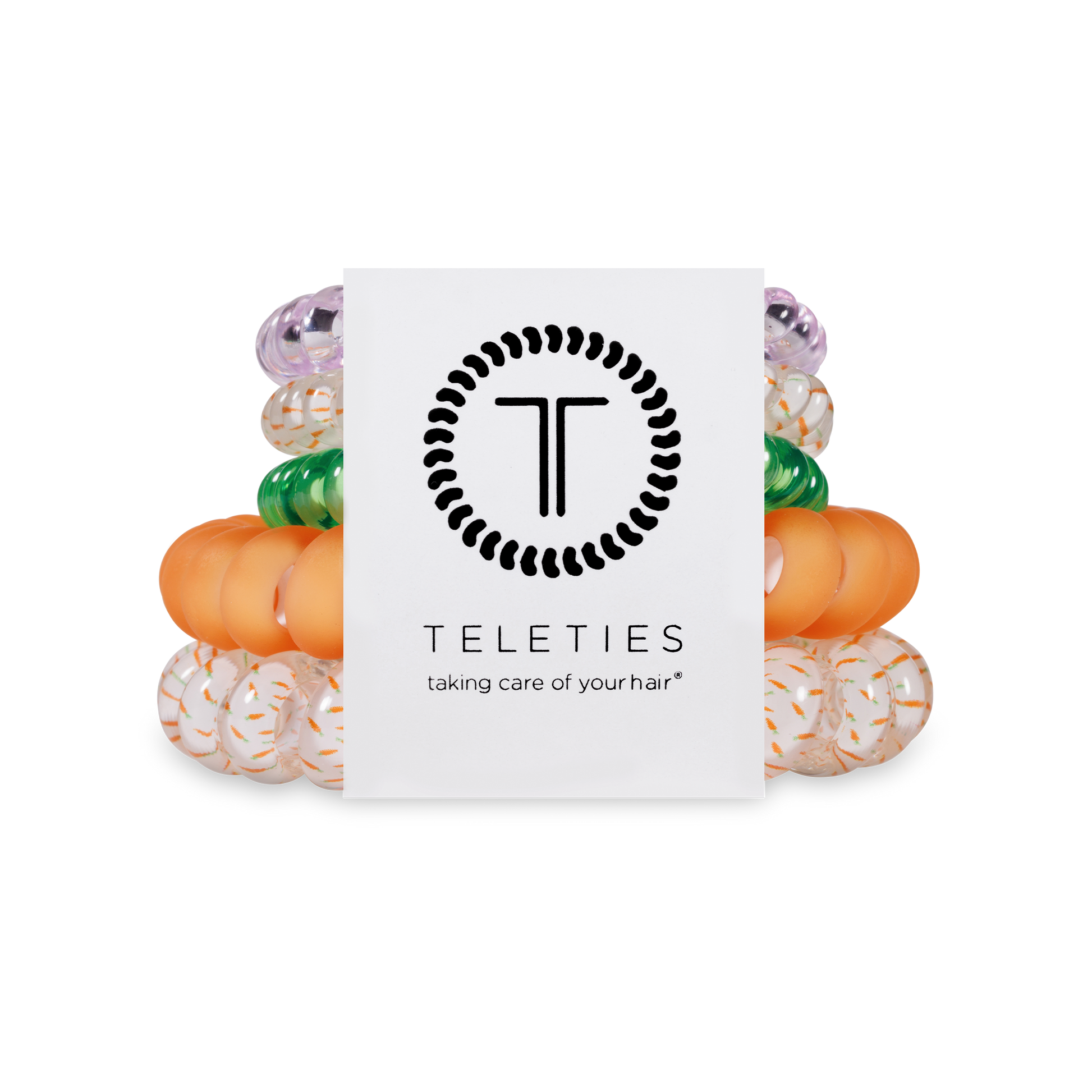 Say hello to TELETIES Hoppy Days! Mixed Pack —the ultimate Easter-ready accessory! This fun mixed pack features cheerful orange, pastel green, purple, and a cute white tie with little carrots, adding a playful pop of color to your spring look.