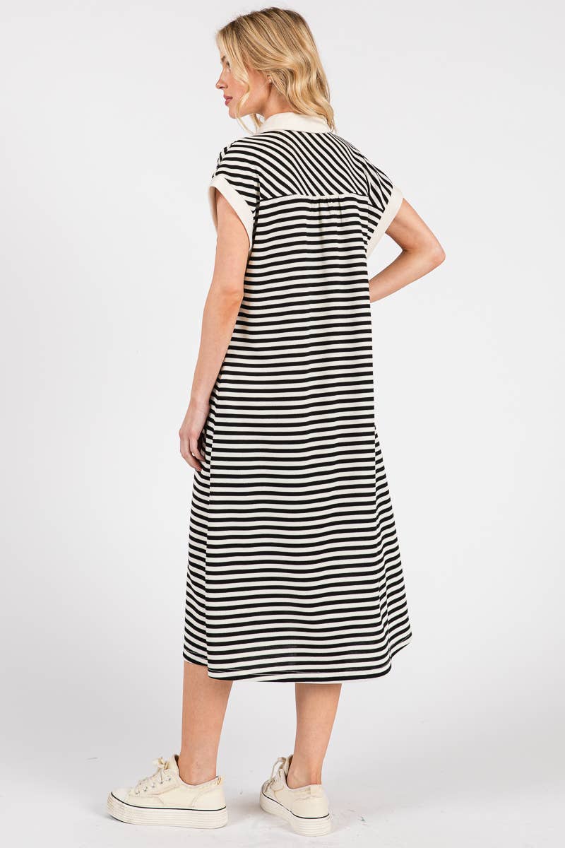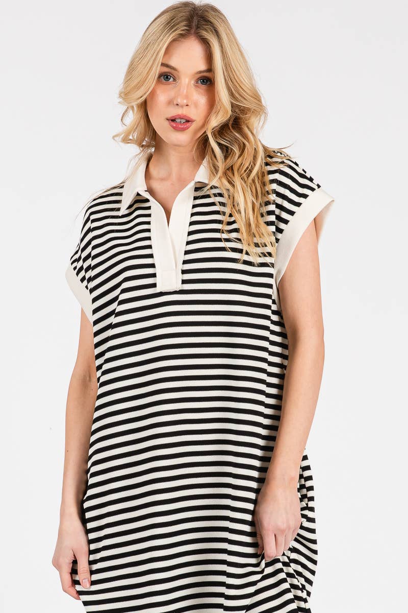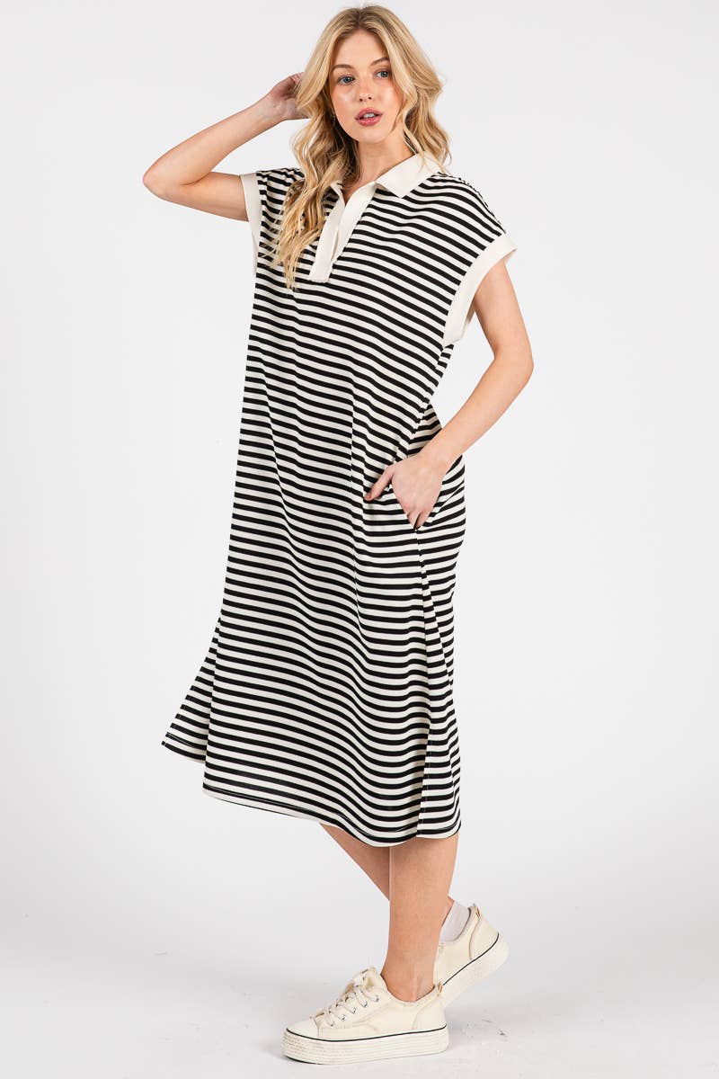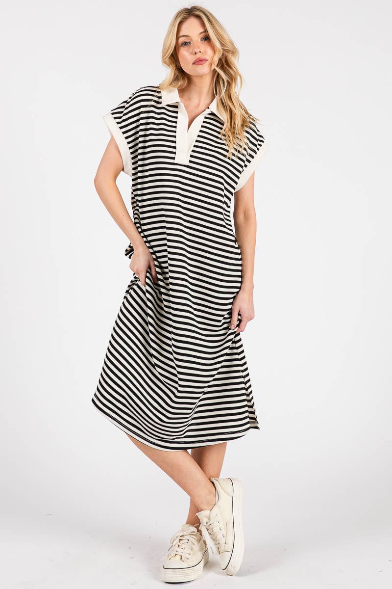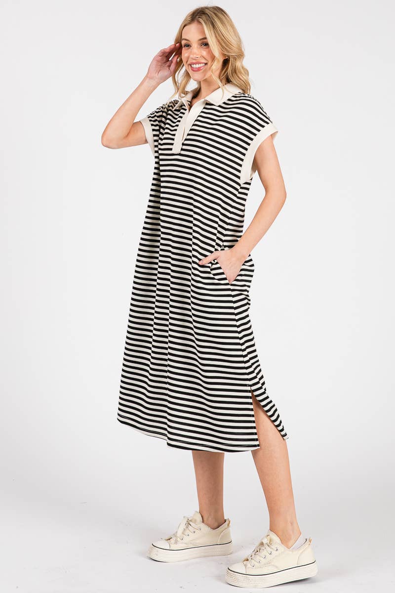 Designed for comfort and versatility, this dress features stripe pattern, a collared V-neckline, and sleeveless drop-shoulder design for a laid-back yet polished look. The loose, flowy silhouette makes it perfect for all-day wear, while the functional side pockets add a touch of practicality.
