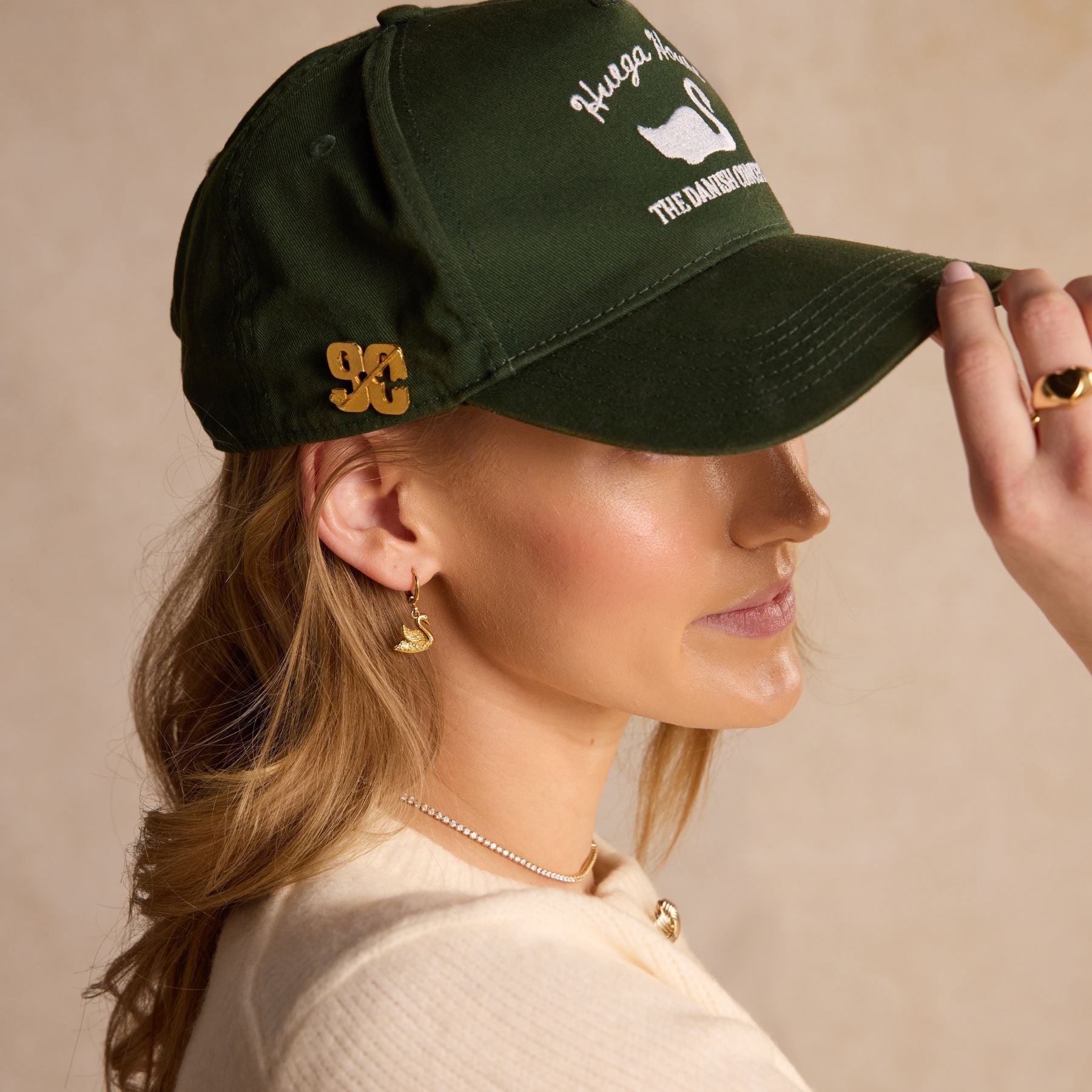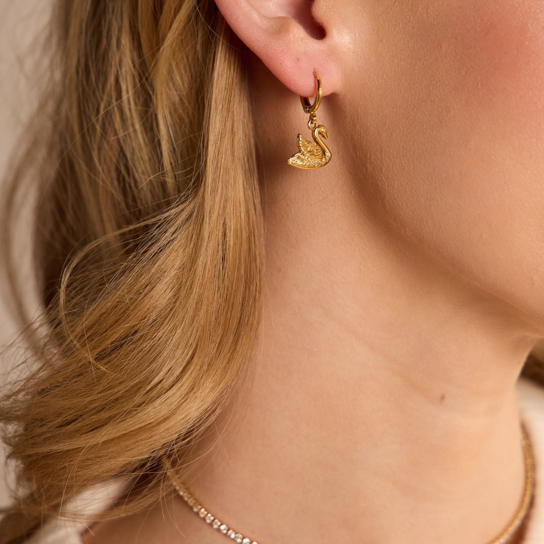 The Swan Huggies feature a gold drop swan on gold huggie perfectly delicate and dainty enough for a second or third piercing but elegant enough to stand alone on their own.