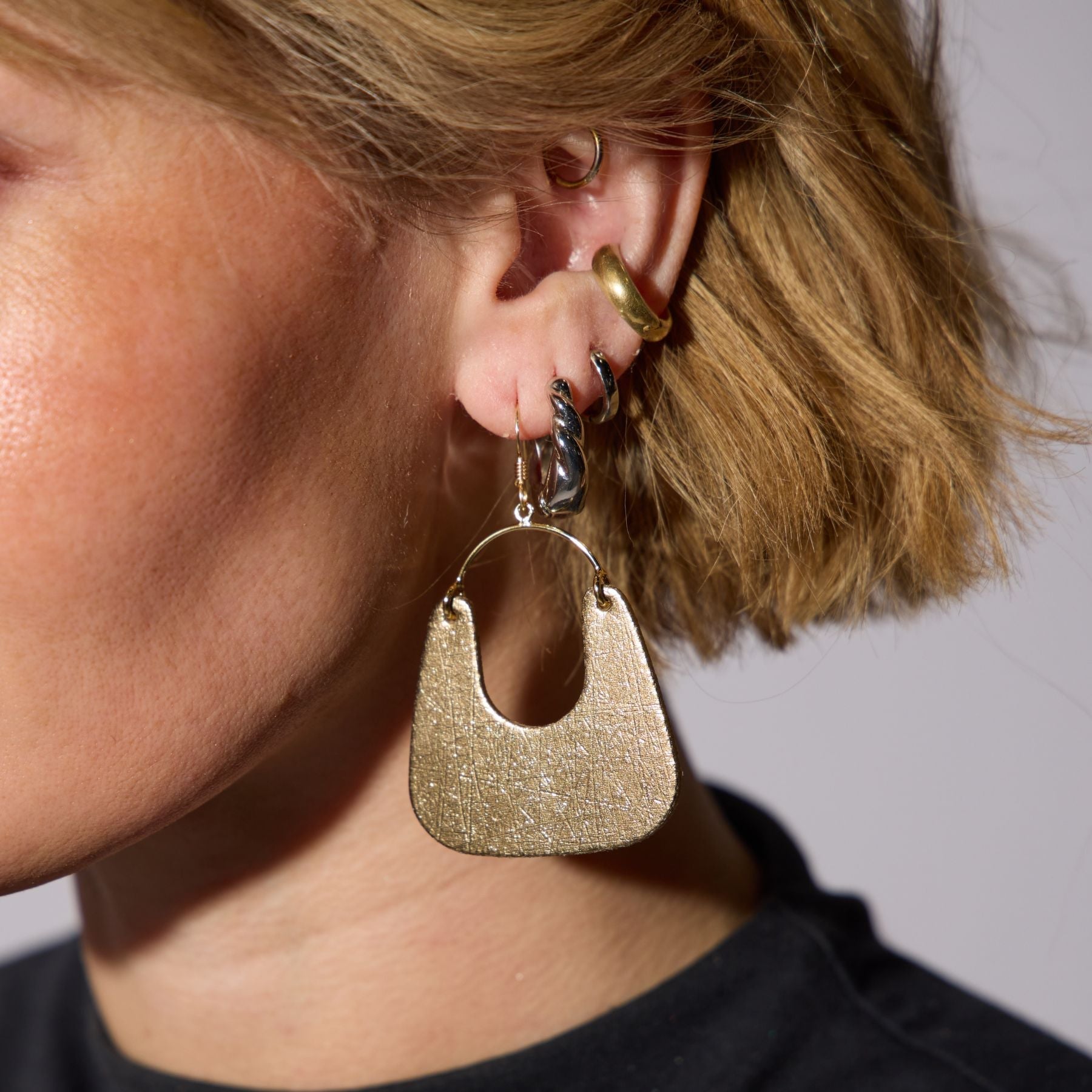 Timeless style meets a modern silhouette with the Vintage Bronze Noras. This lightweight statement earring is created with our metallic vintage bronze leather and gold hardware.