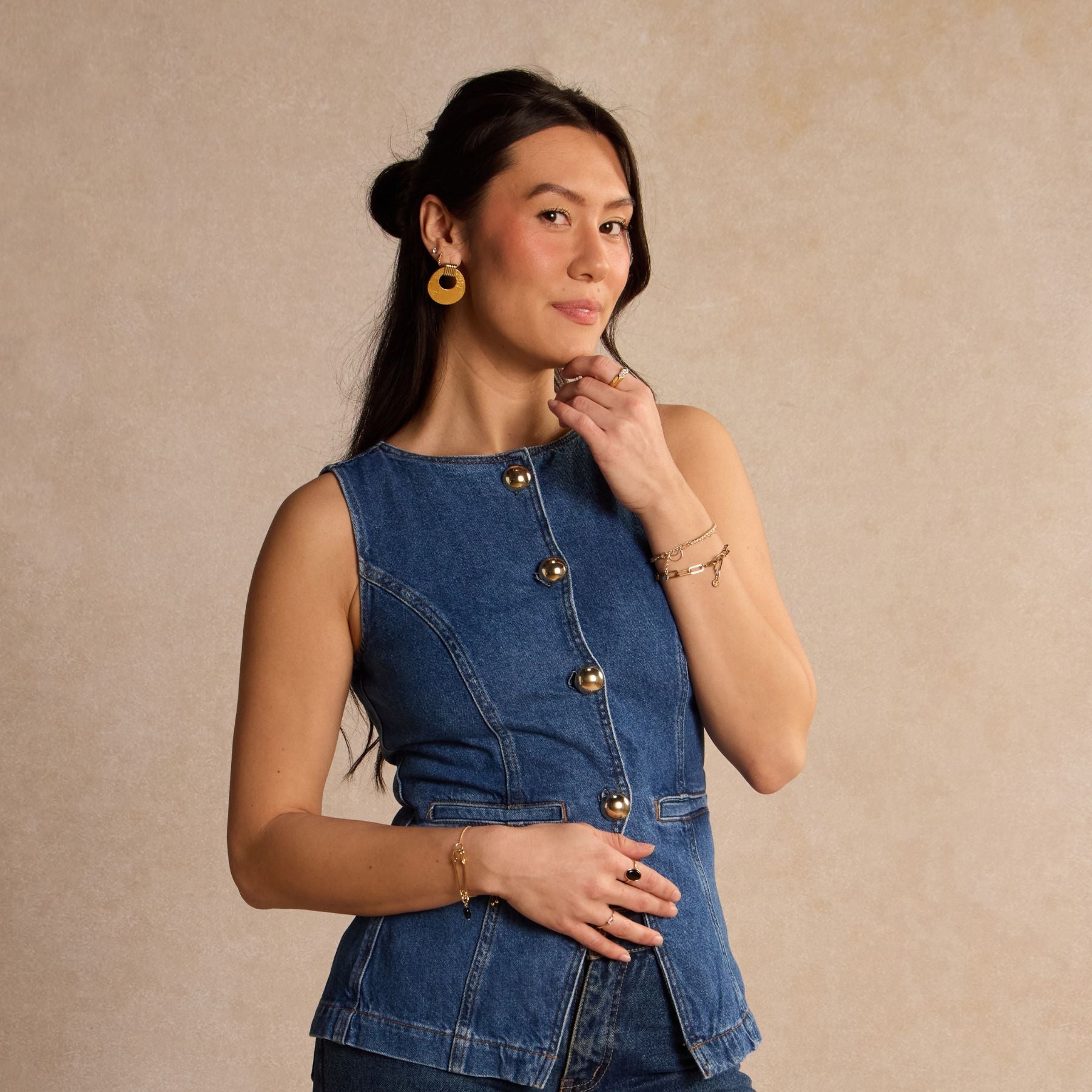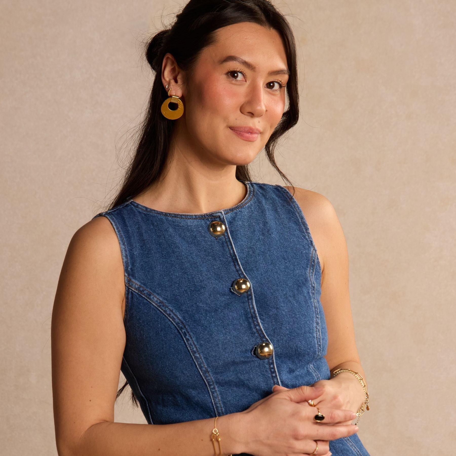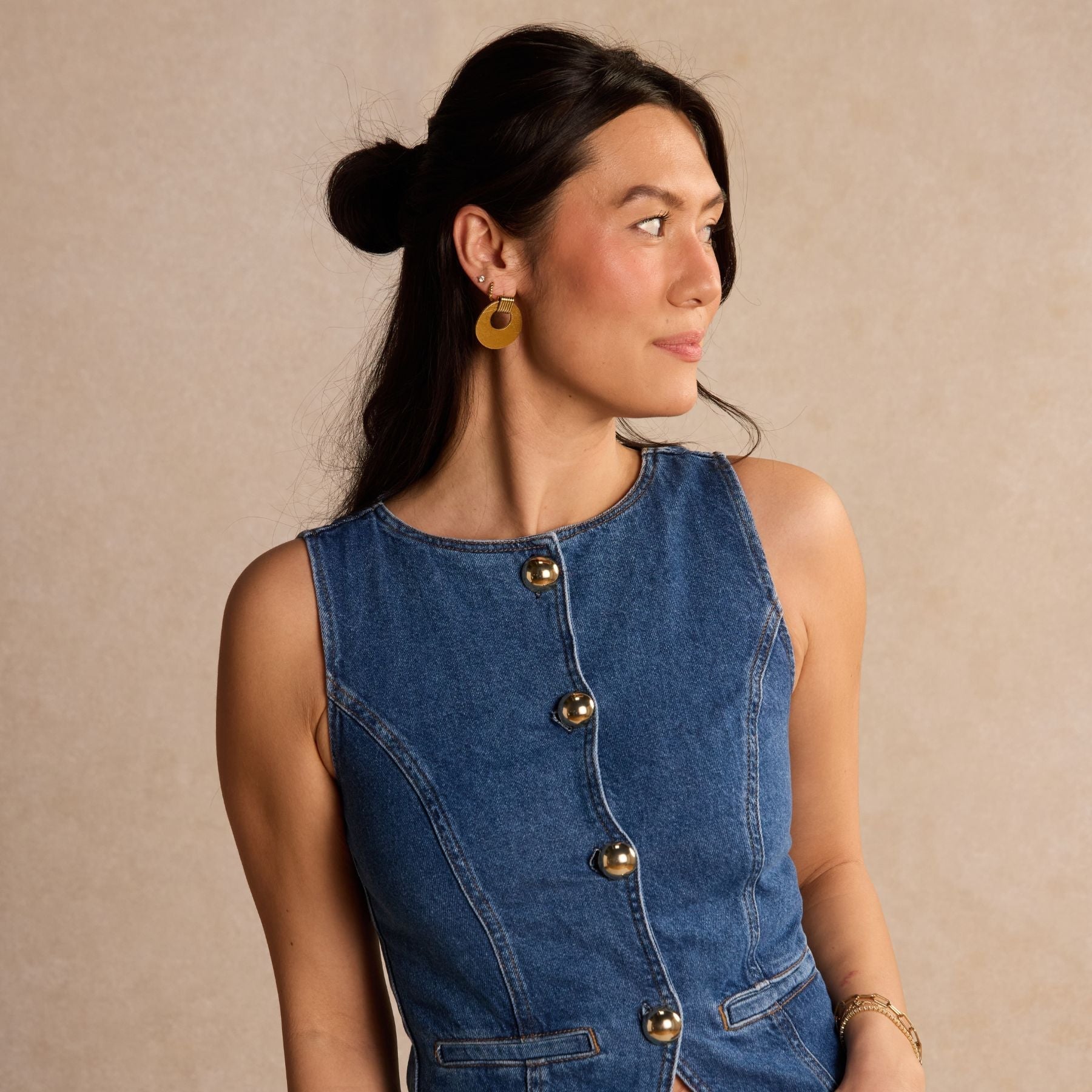 Timeless style meets a modern silhouette with the Vintage Gold Evan. This round lightweight statement earring is created with our Vintage Gold leather and a gold component.