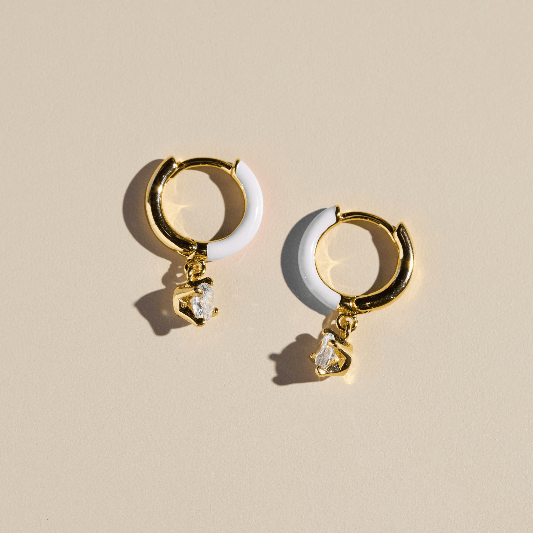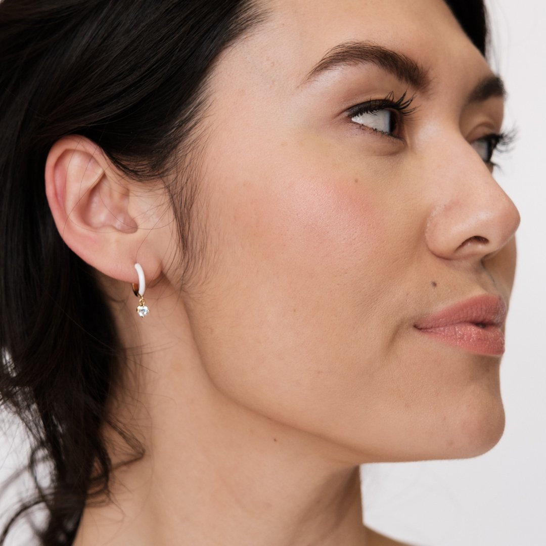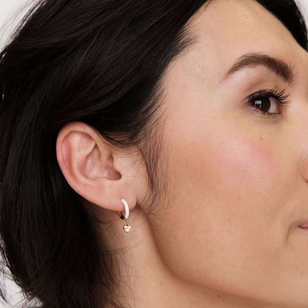 White Ellie Huggies are petite, close-hugging hoop earrings made with bright white enamel, a cubic zirconia drop stone accent, and 14k gold-plated hardware. These delicate hoop earrings feature a hinged closure. These lightweight hoops are perfect for casual wear and small enough to wear in a second or third piercing with your favorite Nickel & Suede statement earrings.