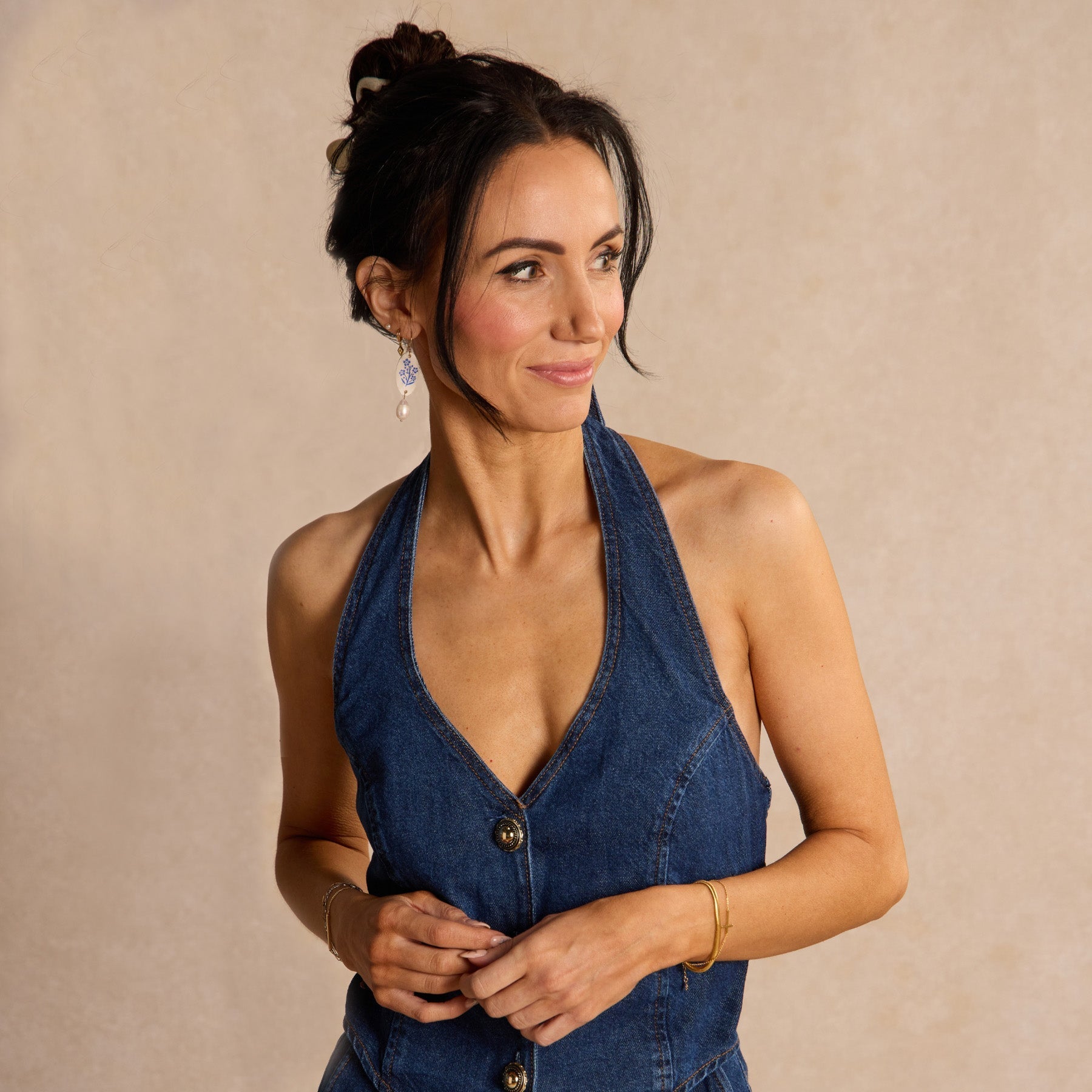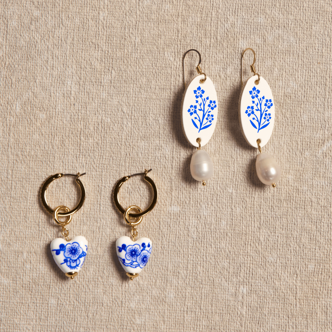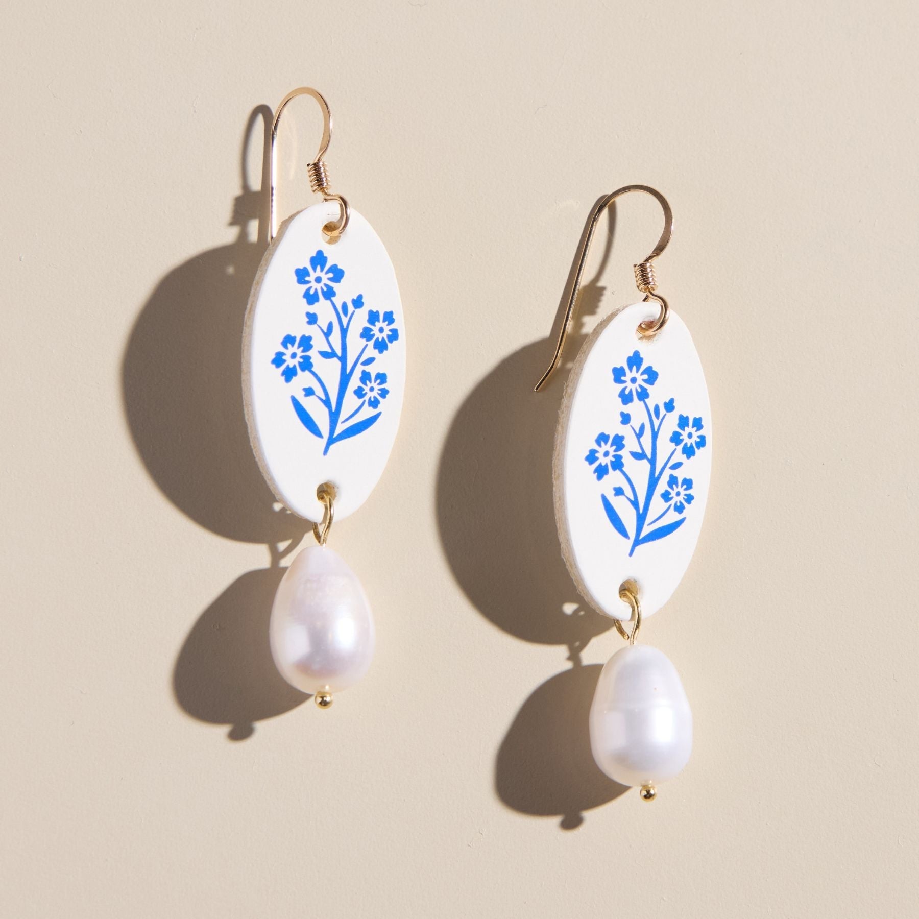 The White Floral Sadie features a delicate blue foil floral design on smooth white leather, with a cultured drop pearl set on gold hardware for a touch of nostalgia and refinement for any occasion.