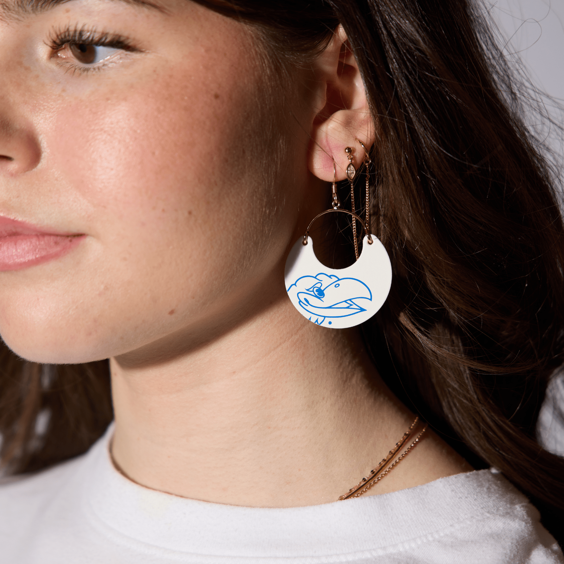 Elevate your game day look with our officially licensed Nickel & Suede University of Kansas Jayhawk Ninas. A cute and chic game day earring that's perfect for showing off your team spirit in style. These monochromatic foiled University of Kansas earrings are a subtle nod to everyone's favorite mascot! This earring is perfect for showing off your team spirit in style.