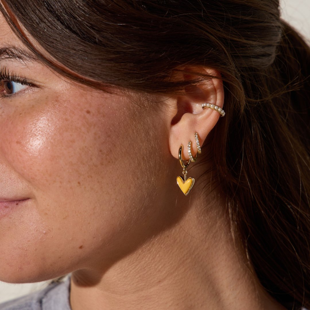 On-trend sweetheart huggies are ideal for mixing and stacking. Inspired by their namesake statement earring, these petite hoops feature a hanging yellow stone charm in gold plating over brass with a hinged closure.